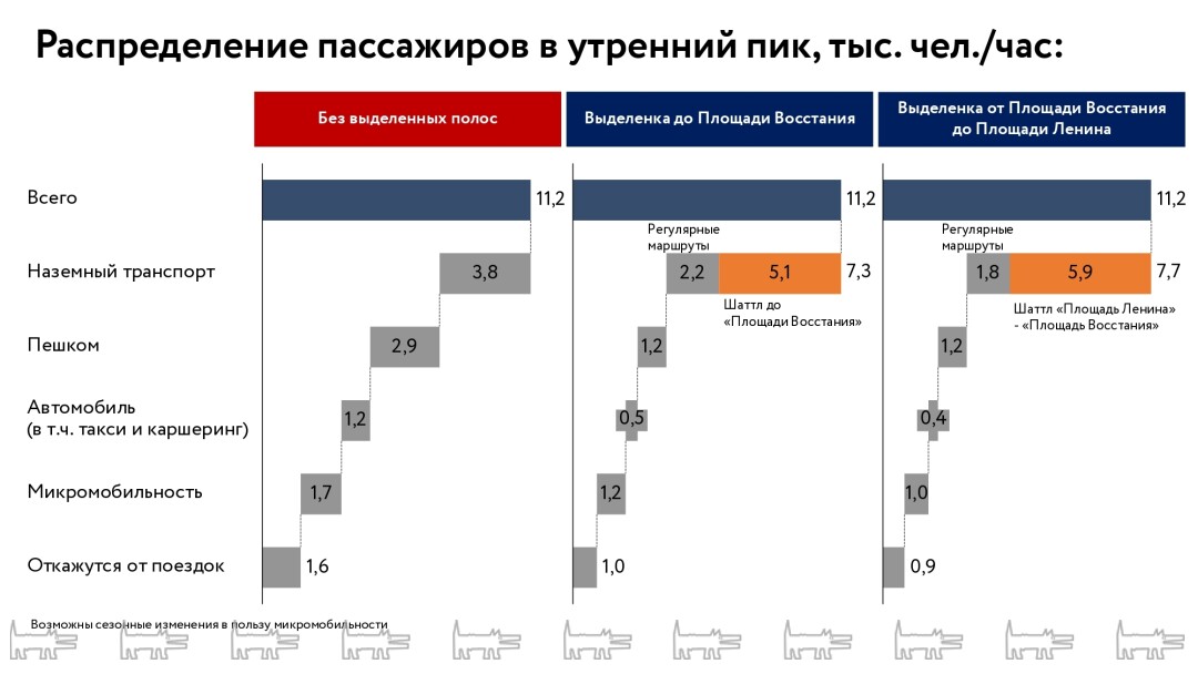 Пассажиропоток на выход из станции «Чернышевская» утром составляет до 11 тысяч человек в час. Альтернатив достойных метро нет: трамвай на Литейном не ходит более 15 лет, а автобусы и троллейбусы регулярно стоят в пробках. В общем потоке наземный транспорт не способен перевозить более двух-трех тысяч человек в час. Принять пассажиров «Чернышевской» они просто не смогут. Даже если автобусы будут переполнены, это не поможет избежать транспортного коллапса. Без выделенных полос автобусы будут ехать медленно — путь до станции «Площадь Восстания» займет 30 минут (вместо привычных пяти). Многие горожане предпочтут идти пешком просто потому, что это проще и быстрее. Транспортный инженер и эксперт OTS Lab Дмитрий Баранов считает, что нас ждет транспортная усталость: «Чем дольше и труднее люди будут добираться до места назначения, тем ниже у них производительность труда и хуже здоровье. Это экономические потери, поддающиеся оценке».