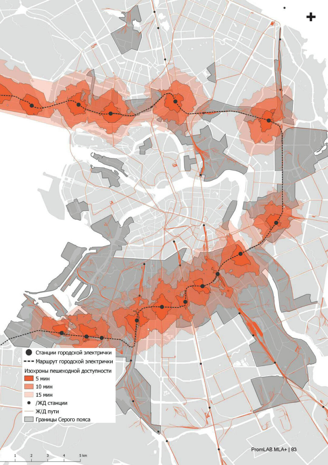 Для организации широтного пассажирского движения можно использовать существующую железную дорогу, которая в настоящее время используется преимущественно для грузового транспорта. Железнодорожная ветка, проходящая по «серому поясу», свяжет три направления (Балтийское, Витебское, Московское) южной части города с другим берегом Невы, Ладожским вокзалом и направлениями северной и восточной частей города. На участке железнодорожных путей, проходящих по территории «серого пояса» возможно устройство четырех новых станций.