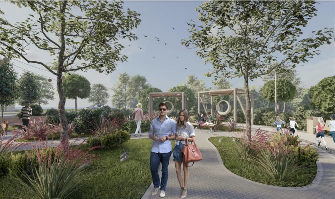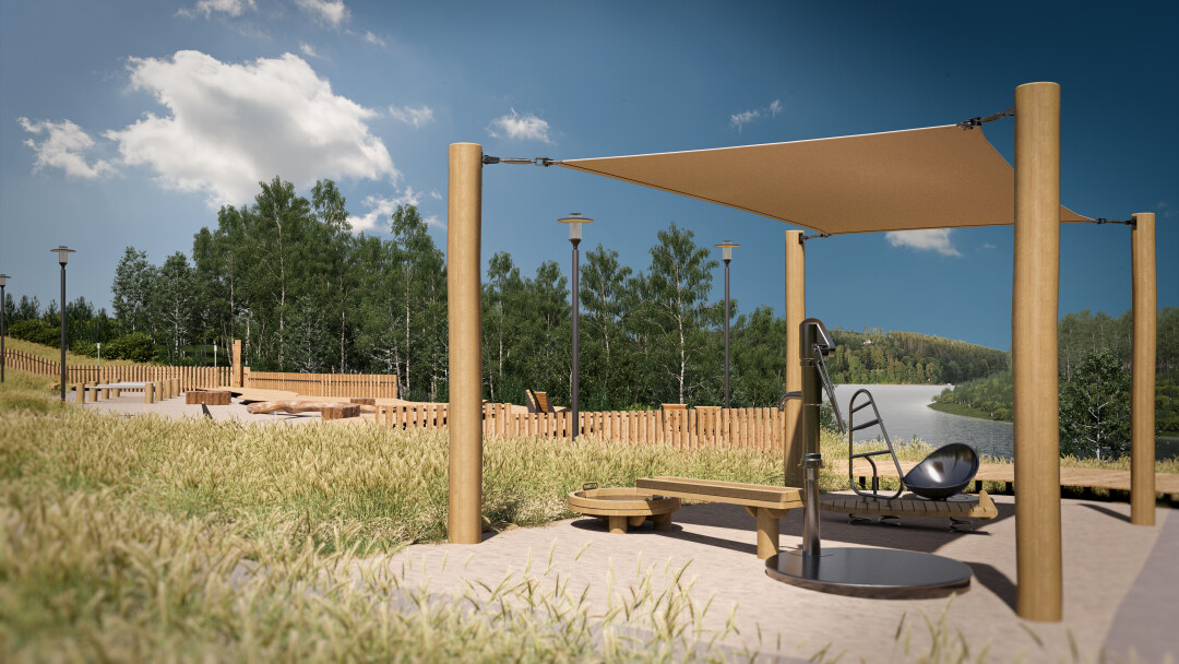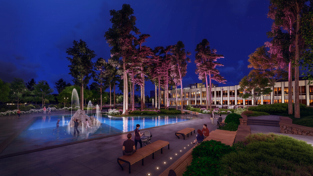 Это проект исторического сквера, разработанный бюро «М4» во главе с Андреем Кобзевым. На территории возле дворца культуры и детско-юношеской школы благоустроят пространство: реконструируют фонтан со специальной системой для игр с водой и режимом светового шоу, а напротив установят скамейки в виде амфитеатра. С северной стороны ДК организуют событийную зону со сценой и амфитеатром. Возле подпорной стенки дюны сделают детскую площадку с качелями, велопарковкой, песочницей и развивающей панелью. Построят летние террасы у ДК «Строитель» и перед входом в ДЮСШ для существующего кафе «Наутилус».