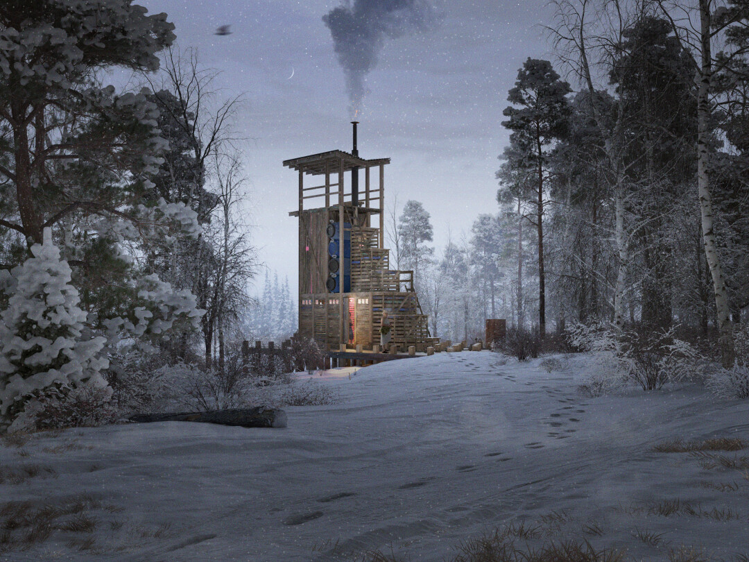 Борис: Правый берег Волги напротив Самары знаменит кутежами и матрасным туризмом. Banya — это возведение самостроя из подручных материалов с совмещением традиционной русской парной и походной каркасной бани с полиэтиленовым тентом. Трехэтажный объем, нарастающий амфитеатром, позволяет париться большой компанией. В нем же — раздевалка и комната отдыха с панорамой на Волгу. В процессе процедуры предполагается перемещение парящихся на верхние полки для повышения температуры воздуха и прыжок в холодную воду с последнего яруса.