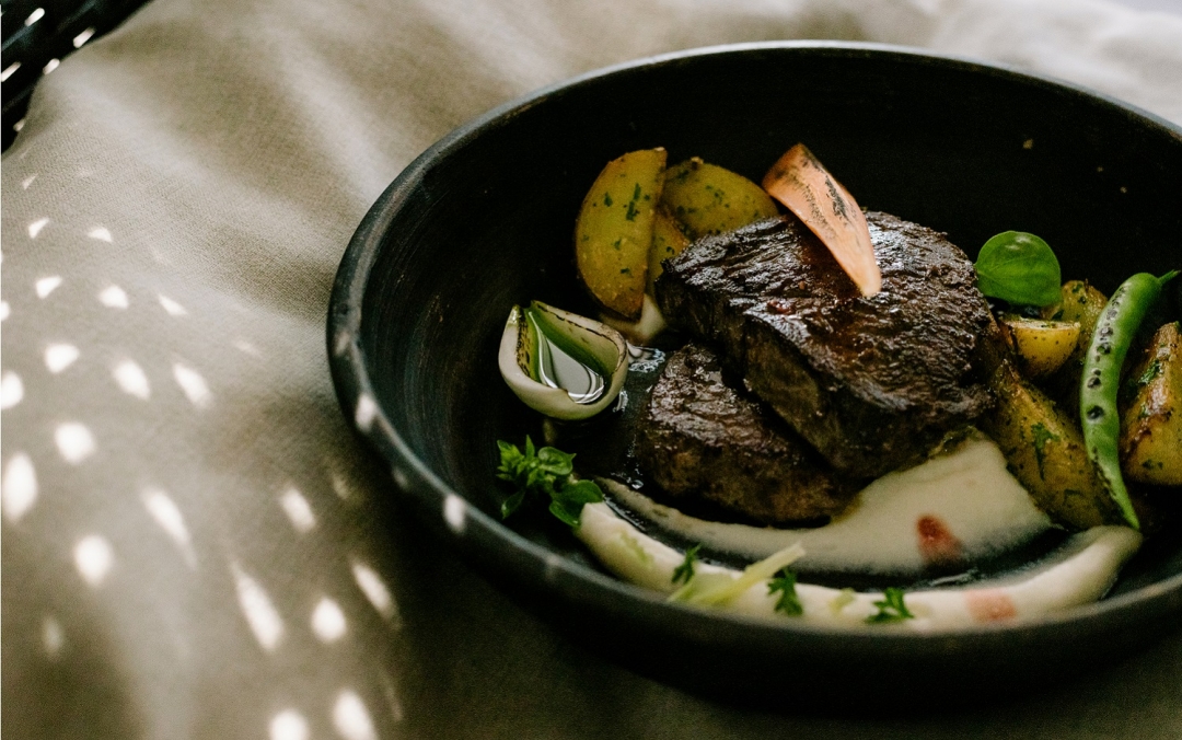 Итак, первоначально собирался делать историю про круассаны. Нашел отличный вариант французской заморозки на сливочном масле, это было сумасшедше вкусно! Купил оборудование, мы начали работать, но поняли, что это не вариант. У нас нет привычки, как у французов, начинать утро с кофе и круассана и делать так каждый день. Люди приходили, пробовали, но в следующий раз мы их видели через неделю. Решение принял быстро — буду делать полноценную кухню. И если аренда террасы была первой случайностью, то второй оказался Максим Бережной. Это мой хороший друг, повар, молекулярщик, суперпрофессионал, у которого всегда катастрофически мало времени. И вдруг он не занят, соглашается прилететь и помочь. Я ему позвонил, спросил совета, а оказалось, что у него две свободные недели. Возражаю ему: «Макс, ты дорогой для меня». Он отвечает, что если я оплачу перелет и проживание, мы сделаем меню. Отдельная история — как это началось. Он прилетел, мы сразу пошли на Центральный рынок, где он перепугал всех продавцов. Огромный, лысый, татуированный, он просил в мясном отделе отрезать сырое мясо и тут же его пробовал. После мы начали проработки, купив все кухонное оборудование. Экспериментировали у меня дома, потому что на кухне террасы еще шел ремонт. В итоге меню удалось! Второй год подряд к нам идут именно за этими блюдами.