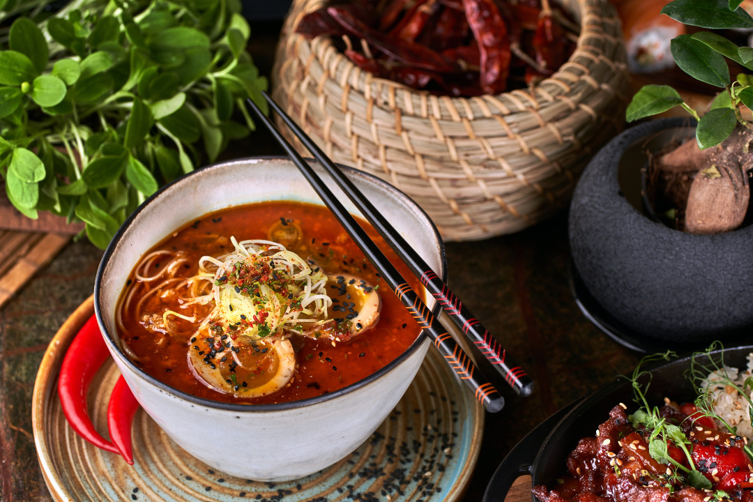 Фишка Asian Kitchen Bar: все соусы и карри пасты варят сами, подают большие азиатские порции и заморачиваются над супами. На проработку традиционного маринованного яйца в рамен ушла не одна сотня штук, ферментированный черный чеснок для варианта «по-хайнаньски» зреет две недели, а рамен дан-дан со сложной текстурой в бульоне вошел в топ продаж.