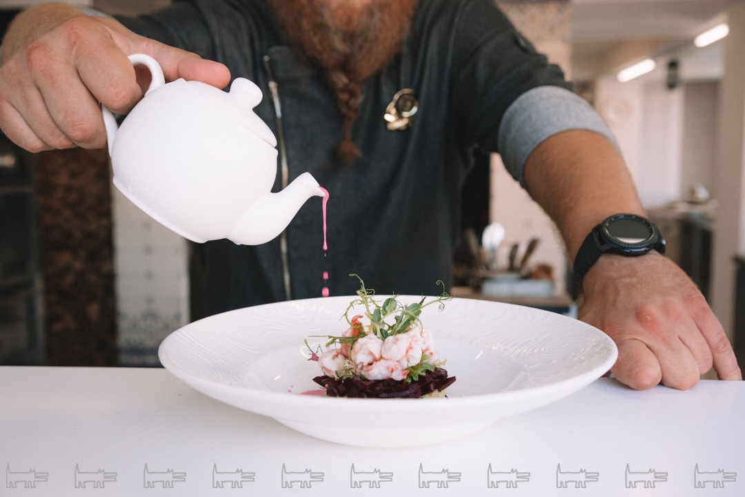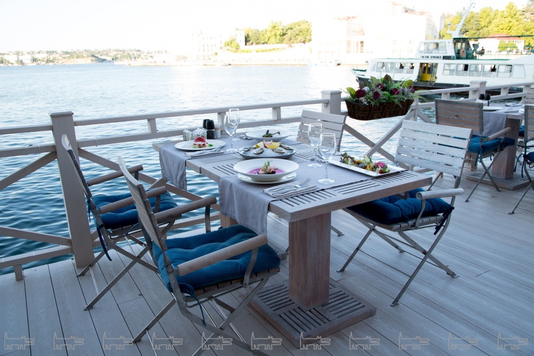 В меню — любимая черноморская барабулька и ставрида. Но готовят ее по-особому: маринуют в вине, добавляют лука, чтобы скрасить запах рыбы и добавить сладость. Калкана запекают в соленом тесте целиком, потом делят на порции. Помимо местной рыбы есть альтернатива: лосось, северный муксун, щука. Скоро добавится родниковая форель и белый амур.