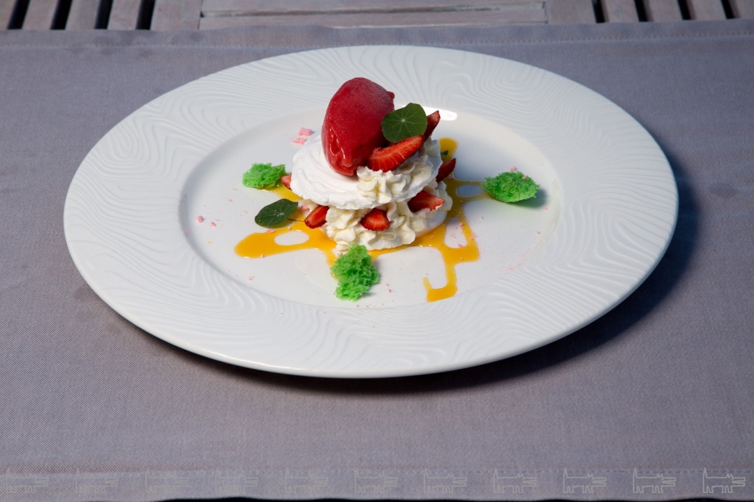 Так, в салатах сочетают фермерский козий сыр и сезонные фрукты или овощи, коренья. Для приготовления мидий используют местное вино сорта алиготе, у которого яркий букет и ароматика. А десерт «Анна Павлова» подают с сорбетом из холмовской клубники. Готовят его с лаймом, сычуаньским перцем, туда же добавляют лемонграсс, который растет в Ялте, мед из акации и чуть-чуть массандровской мадеры.