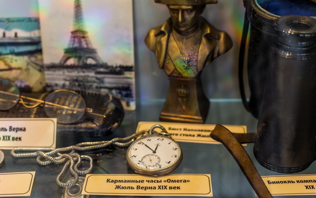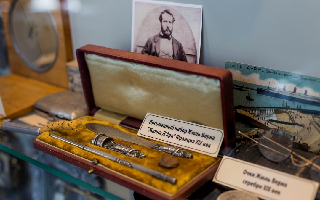 Экспонаты в «Жюле Верне» собраны силами собственника ресторана-музея. Один из первых телефонных аппаратов, прототип 3D очков начала XIX века, фонограф Эдисона, которому сто двадцать пять лет, — все куплено у частных коллекционеров, на антикварных рынках России и ближнего зарубежья. Особая гордость — свидетельство о вручении Жюлю Верну ордена Почетного легиона с подлинной подписью Наполеона. А еще первые издания писателя на французском языке.
