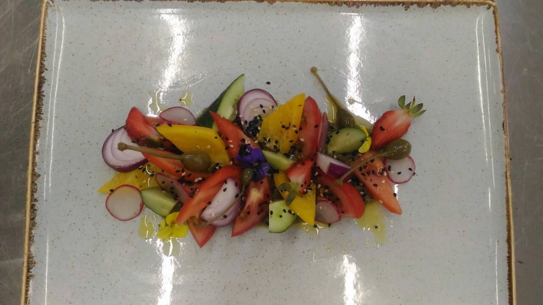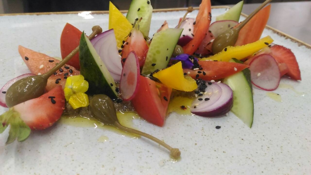 Сперва взбиваем оливки, орегано и оливковое масло блендером. Вот вам крем-паста, которую с чувством, с толком, с расстановкой выкладываем на тарелку. Заявленные овощи красиво нарезаем и размещаем на кремовой зеленой подушке. Небрежно украсим композицию клубникой, каперсами, посыплем черным и классическим кунжутом. Свежо, витаминно, звонко!