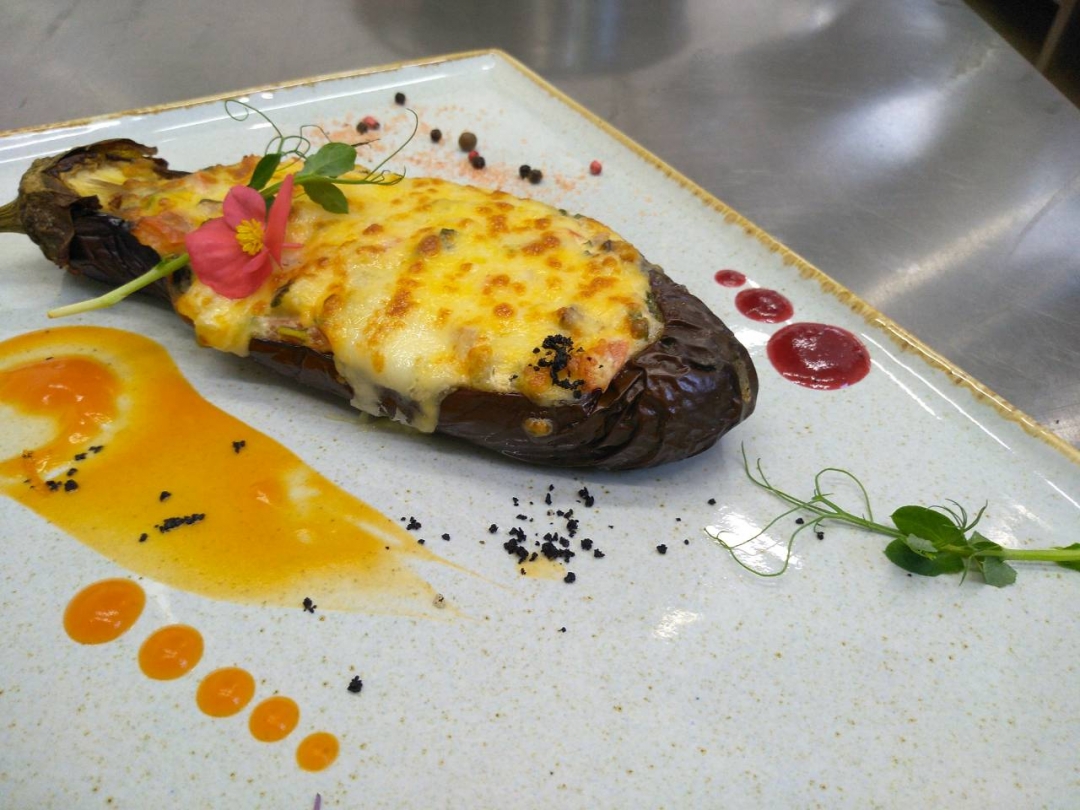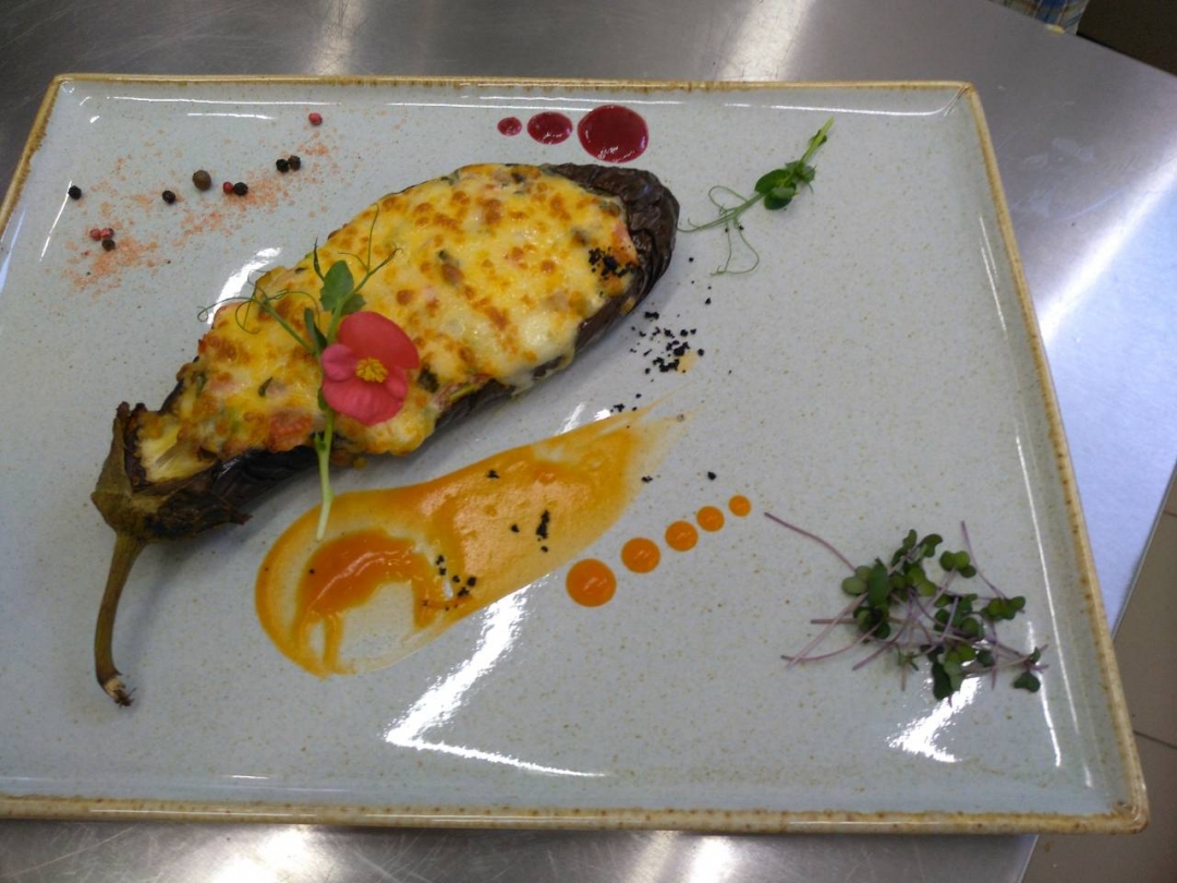 В это время лодку из баклажана предварительно запечем в духовке при 160–170 градусах в течение десяти минут. Смягчив нрав главного овоща, фаршируем баклажан смесью из обжаренных в сметане овощей. Присыплем буйство витаминов сыром российским и отправим на пятнадцать минут в духовку при тех же 160–170 градусах.