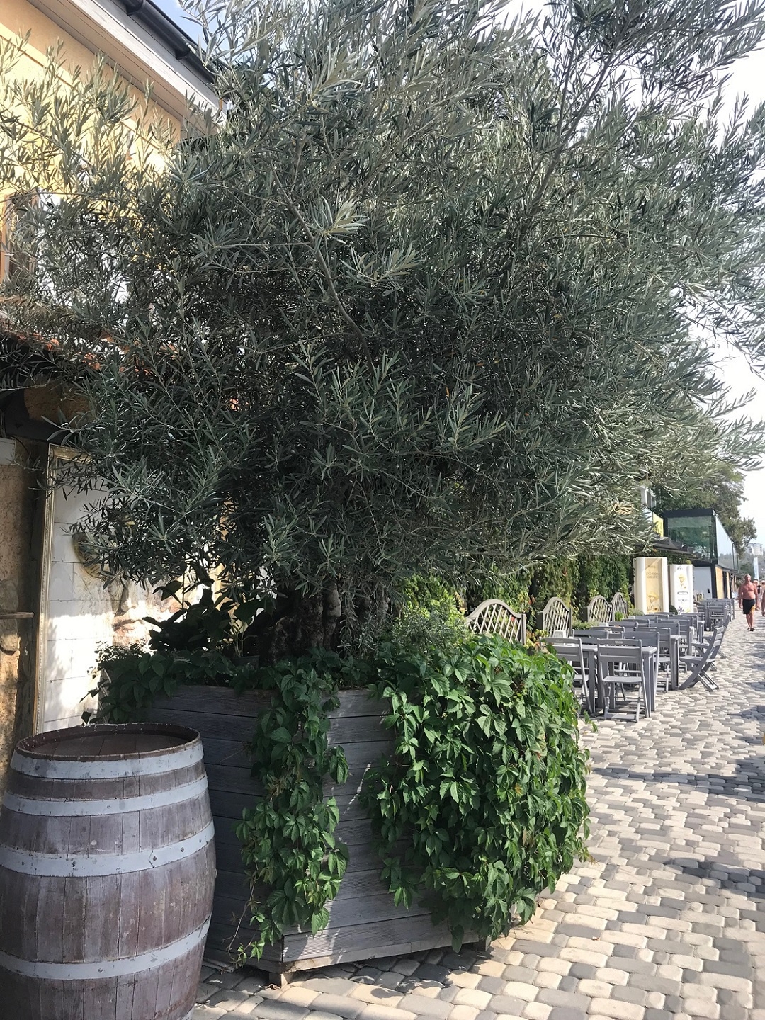 У нас есть свои оливковые деревья, урожай собираем каждую осень. Три взрослых дерева мы высадили в клумбы перед кафе сами. Также на Массандровском пляже есть еще пять деревьев. Если собираем оливки зелеными, то прокалываем каждый плод и вымачиваем в воде около тридцати дней, чтобы ушла горечь. Если мы немного подержим их на дереве, пока они не станут бурыми, то будет другой метод. Мы их прокалываем, несколько раз замораживаем и размораживаем. После этого пересыпаем оливки солью, они засаливаются и через неделю-полторы будут готовы. Затем перелива ем их оливковым маслом и храним всю зиму.