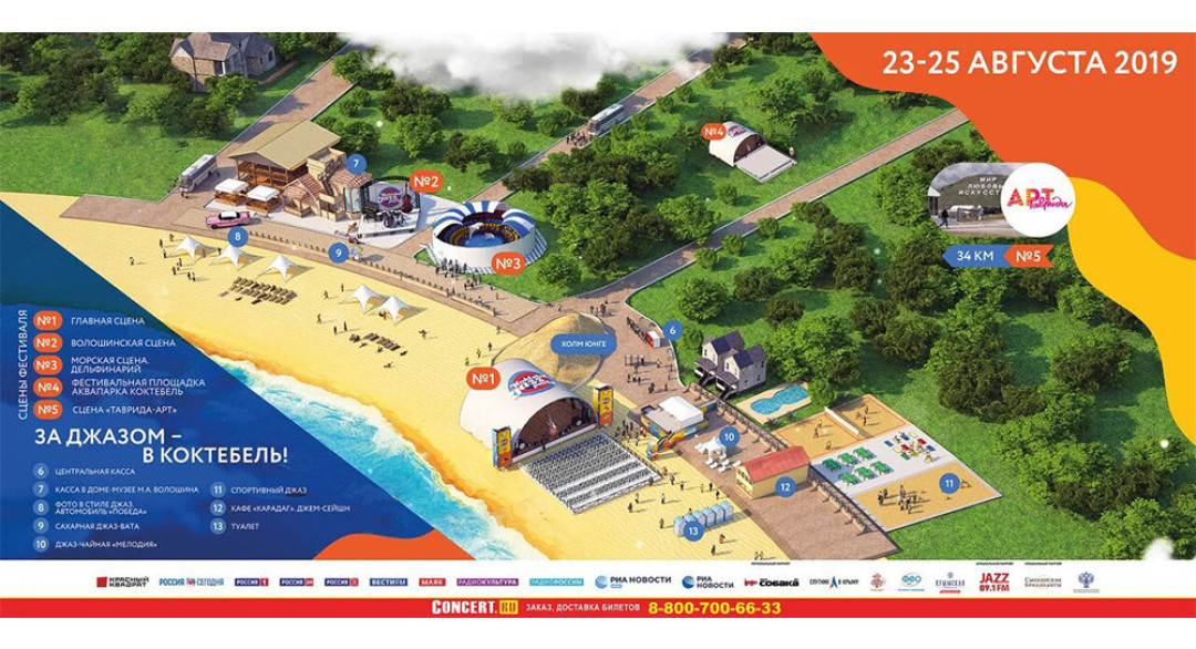 В этом году к традиционным Главной и Волошинской сценам, коктебельским аквапарку и дельфинарию добавится новая - сцена «Таврида-Арт». Для удобства посетителей на сайте KJPразмещена карта с обозначением всех музыкальных площадок и других сервисов фестиваля.
