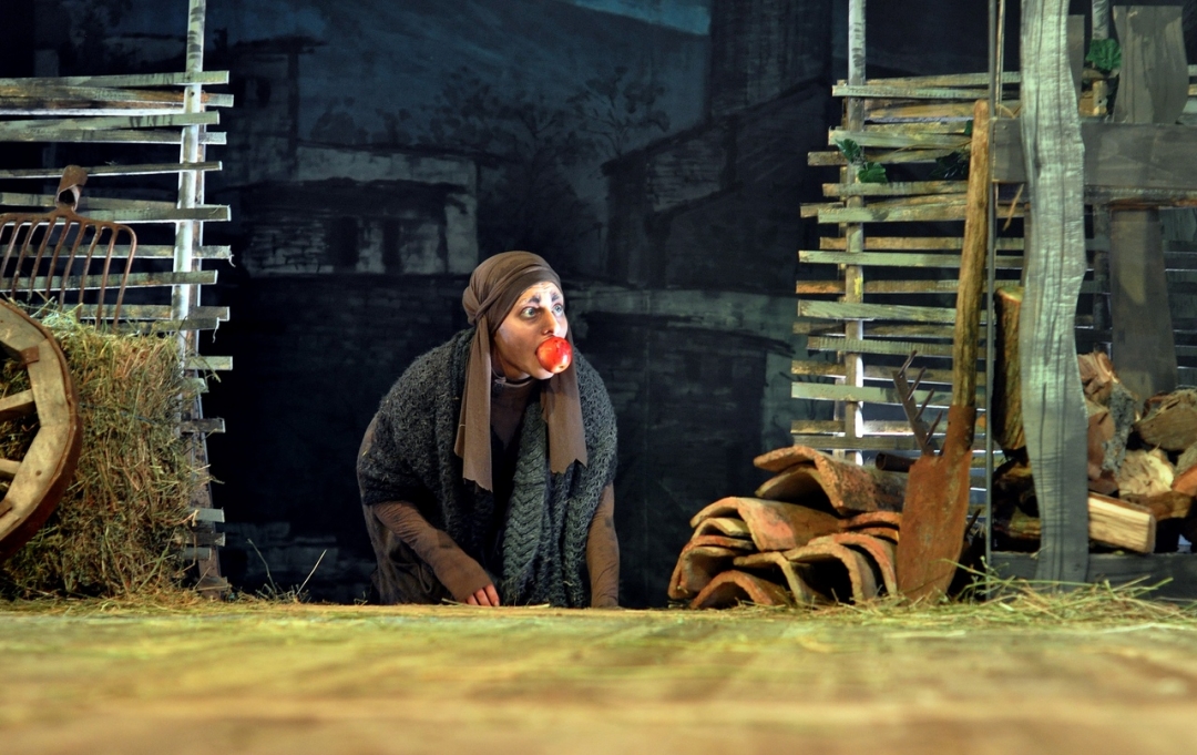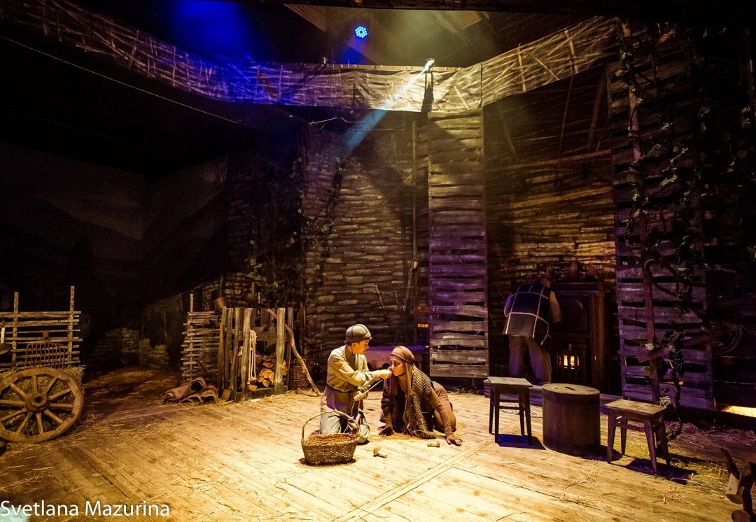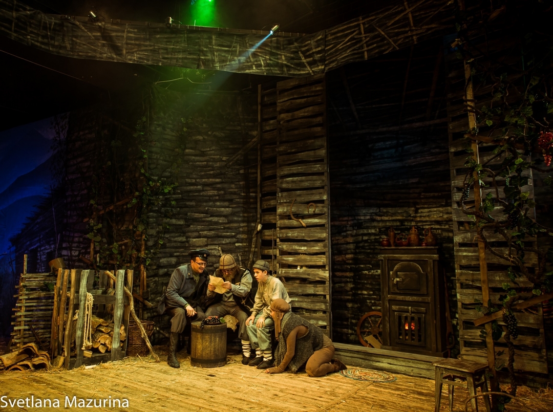Прекрасная Грузия и проклятая война. Девственный рассвет и голодное утро деда Спиридона (Сергей Новиков) и его внука Гогиты (Миша Перевертов). Домашний уют и ужас от встречи с буфетчиком. Знакомство с собакой по кличке Собака. Фактура драматического материала подарила артистам возможность работать в жанре психологического театра, а колорит Грузии стал плацдармом для оформления сценографии, в которой живет воздух времени, живут люди, окруженные целым миром звуков и всевозможных вещей: старинной посуды, плетенных корзин, тканных ковриков, налитых гроздей винограда… Все это, как и точные световые сочетания, создает атмосферу и несет эмоциональный заряд в зрительный зал.