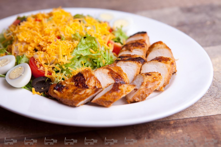Салат из овощей с цыпленком-гриль, сыром чеддер и медово-горчичным соусом.