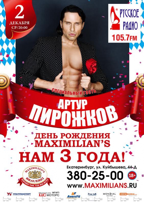 2 декабря баварский клубный ресторан Maximiliansпразднует свой трехлетний юбилей. Специальный гость вечера – неподражаемый Артур Пирожков. Приходите, будет огненно, вкусно и весело! Начало вечеринки – в 20.00