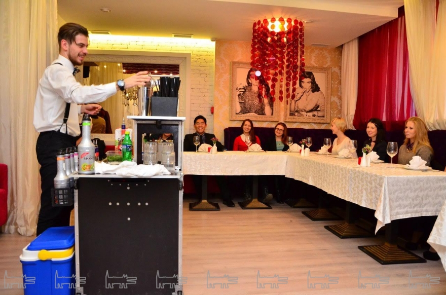 Мероприятие подходит для компаний от 8 до 25 человек. Прямо возле вашего стола устанавливается мобильная барная стойка. Выделяется специальный "харизматичный" бармен. Он рассказывает о коктейлях, показывает как их делать. Потом каждый участник банкета выходит и готовит коктейль себе или кому - то из присутствующих под чутким руководством бармена. Все проходит весело и интересно, в среднем занимает около часа. Коктейли для мастер класса нужно утвердить заранее.