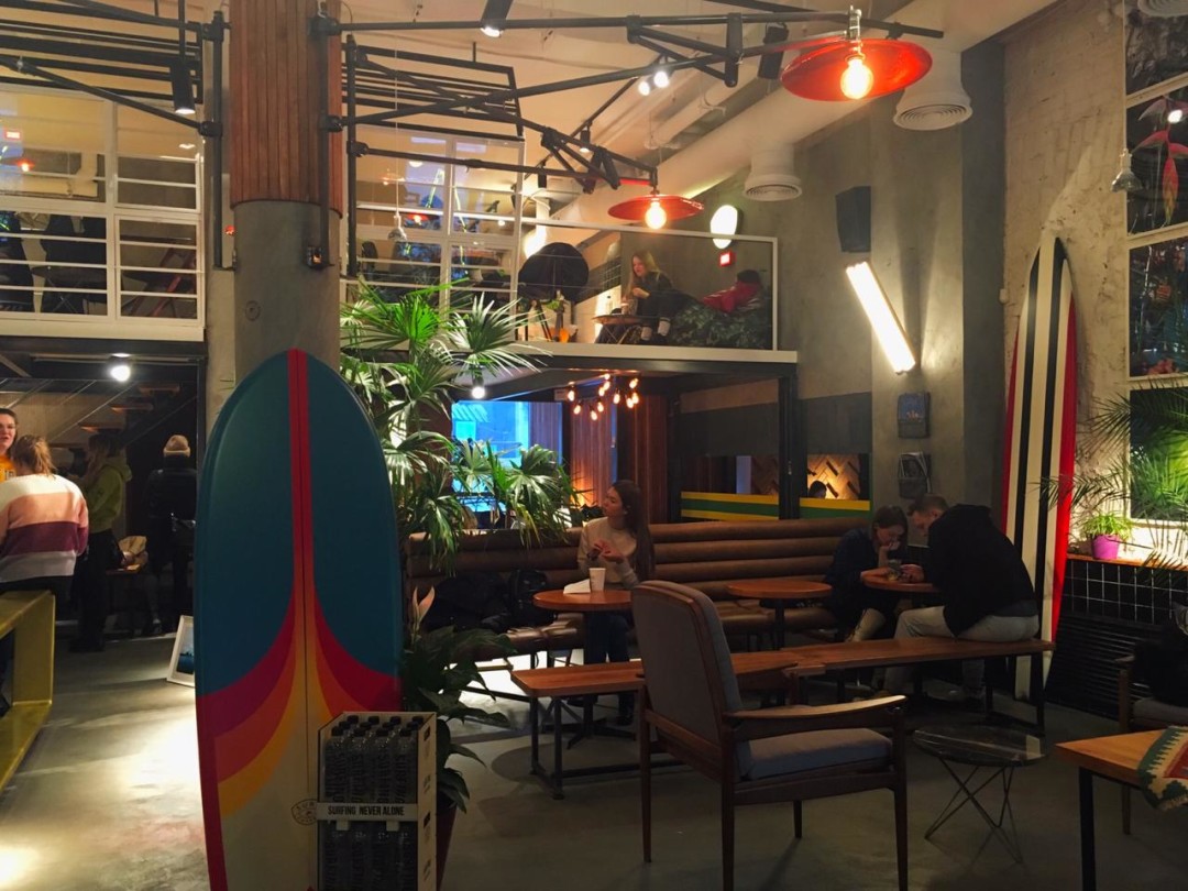 Небольшая двухэтажная кофейня, расположенная сразу за «Пассажем» вернёт вас (хотя бы не на долго) на пляж. Интерьер летний – пальмы, яркие картины и диваны, доски для сёрфинга и различные маленькие безделушки, от которых поднимается настроения.