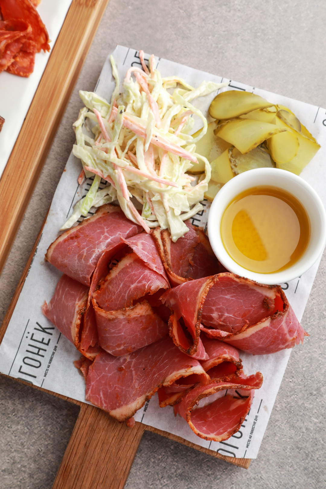 Пастрами с Коул слоу и медово-горчичным соусом - еще одна удобная и сытная закуска для компаний. Блюдо принадлежит еврейской кухне Молдавии и Румынии. В Новый Свет перекочевало с еврейской иммиграцией начала XX века и считается традиционным блюдом нью-йоркской еврейской кухни.