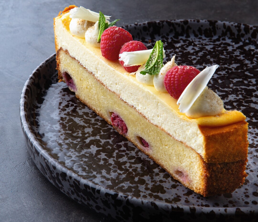 10. Нарежьте десерт на аккуратные тонкие ломтики, украсьте свежей малиной и подавайте.