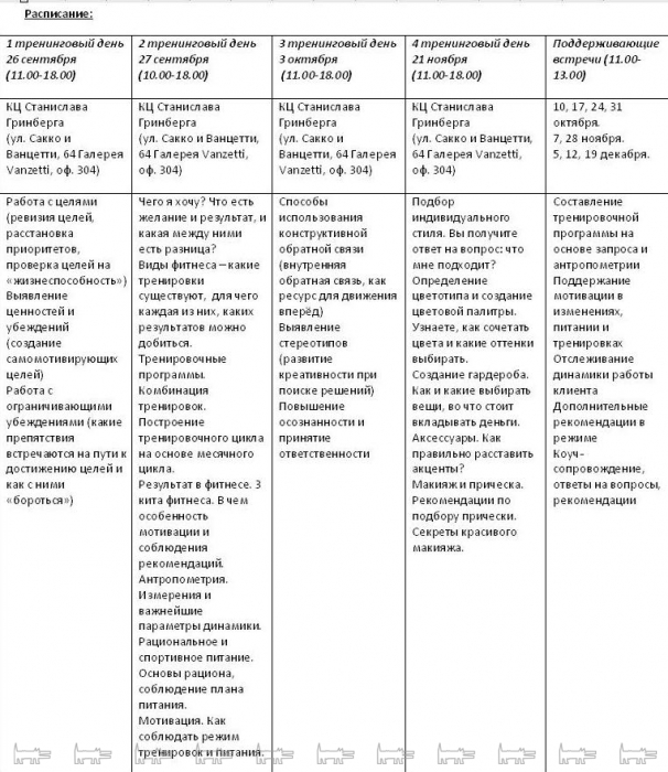 Продолжительность курса 3 месяца. Курс включает 4 офф-лайн встречи со спецалистами в выходные дни (11.00-18.00), 9 поддерживающих встреч в скайпе, общение в закрытой группе в WhatsApp, выпускной вечер в известном клубе города.