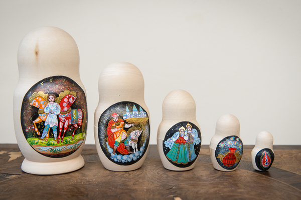 Создание матрешки – процесс кропотливый. Сначала делается заготовка, как правило, из липы или березы. Самое главное в ней — это подгонка деталей, каждая последующая матрешка должна плавно входить одна в другую и не болтаться. Заготовки я сам не делаю, покупаю готовые в Москве на вернисаже, привожу их домой и каждую покрываю грунтом. Грунт – это обычная смесь крахмала и воды, ее еще в советские времена использовали вместо клея для обоев. Грунт губкой наносят на матрешку, он высыхает, потом матрешку шкурят и операция повторяется еще несколько раз. Делается это для того, чтобы кисточка , при нанесении рисунка, не задевала дефекты дерева. Затем матрешка раскрашивается и лакируется: ее опускают в банку с лаком на несколько секунд, вынимают и тут же сушат несколько часов вниз головой. Мало кто знает, но открывать готовые матрешки можно только на излом, ее нельзя крутить, иначе краска на краях быстро отслаивается.