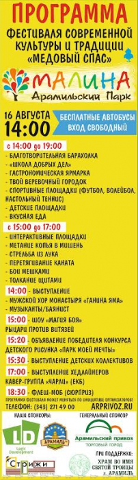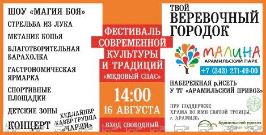 Старт фестиваля «Медовый спас» и торжественное открытие арамильского парка «Малина» – 16 августа в 14:00.