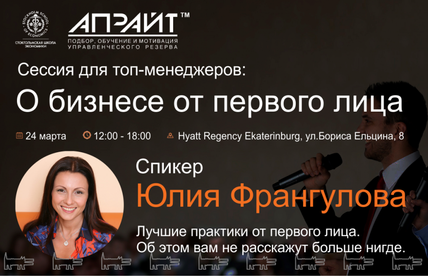 24 марта в 12.00-18.00 в «Хаятт Ридженси Екатеринбург», состоится сессия для топ-менеджеров «О бизнесе от первого лица». Участниками мероприятия станут управленцы и предприниматели из Екатеринбурга, Челябинска, Перми, Тюмени – всего около 100 человек.