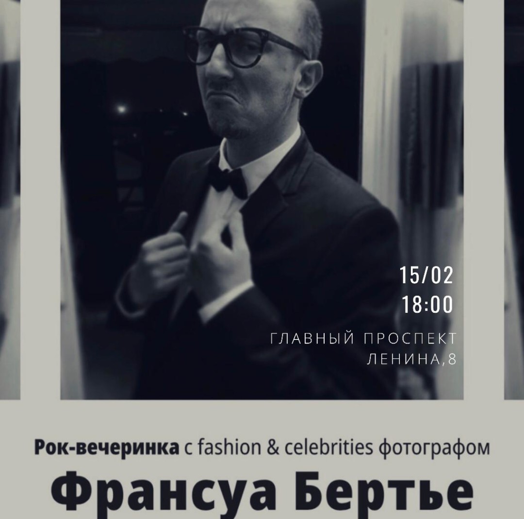 Франсуа Берте - рок-журналист и известный Французский фотограф, в объективе которого постоянно оказываются такие звёзды как Леди Гага, Леонардо ДиКаприо, Дэвид Линч, Том Хэнкс, Стивен Спилберг приезжает в Екатеринбург! Его выставка «Звёзды кинематографа» в лаунже Главного проспекта и 15/02 мы приглашаем гостей на творческую встречу с фотографом, которая пройдет в формате рок-вечеринки. Гостей вечера ждёт фуршет, выступление рок-группы М А Р К, музыкальный зарисовки на гитаре самого Франсуа Бертье и общение с фотографом в формате open talk.