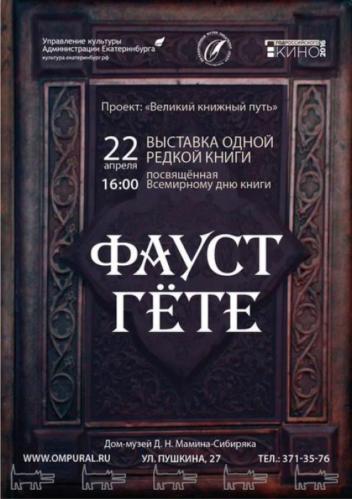 22 апреля в 16.00, в преддверии Всемирного дня книг и авторского права, который отмечается ежегодно 23 апреля, а также в рамках проекта «Великий книжный путь» в Доме-музее Д. Н. Мамина-Сибиряка открывается выставка одной редкой книги – «ФАУСТ. ГЁТЕ».