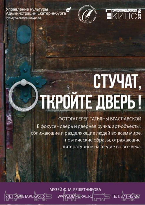 Музей Ф. М. Решетникова в течение многих лет сотрудничает с фотографом Татьяной Браславской. На её новой выставке в конюшне музея можно будет увидеть снимки дверей, ворот, фрагменты дверных комплексов жилых домов, замков и церквей. География выставки обширна – это фото дверей из России, Хорватии, Латвии, Австрии, Италии, Чехии и других стран.