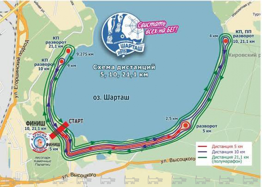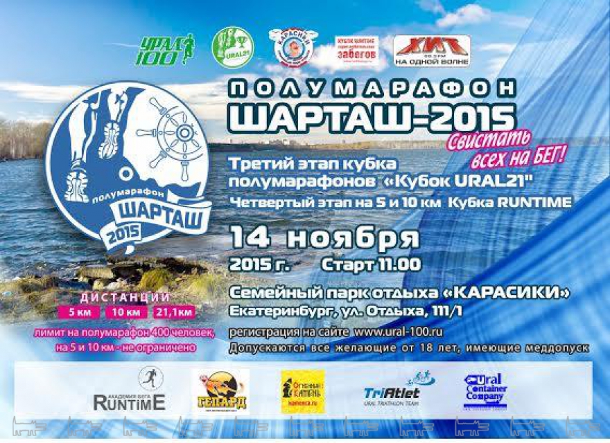 14 ноября 2015 г. в Екатеринбурге на озере Шарташ будут проводиться легкоатлетические соревнования. Старт в 10:00 организуется на базе семейного парка отдыха «Карасики», г. Екатеринбург, ул. Отдыха 111/1.Маршрут полумарафона будет проходить по асфальтированной дороге вдоль береговой линии озера Шарташ.