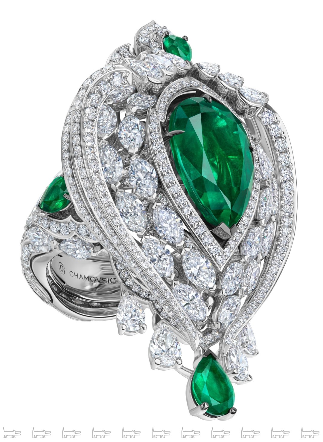 Помимо драгоценного «Петергофа» ювелирный дом CHAMOVSKIKH представит коллекцию «Искусство флирта», ювелирную интерпретацию главного театрального атрибута – веера, а также серию Jazz Age, вдохновением для которой стала эпоха джаза. Особого внимания заслуживает парюра «Великая держава», посвященная образу Российского государства. В центре драгоценностей – редкие инвестиционные изумруды весом более 40 карат с восхитительными характеристиками чистоты и цвета. Эти и другие украшения с запатентованными механизмами от ювелиров CHAMOVSKIKH можно увидеть в рамках выставки.