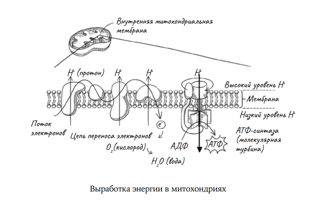Мышцы используют АТФ, чтобы генерировать энергию для сокращения. В нашем мозге АТФ создает электрическое напряжение на мембранах нейронов для передачи электрических сигналов и генерации импульсов. Общее количество АТФ, образующееся за сутки в организме человека, сопоставимо с массой его тела, причем пятую часть всего АТФ потребляет мозг. Работа мысли сама по себе требует нескольких сотен калорий в день. И почти весь этот объем производят митохондрии. Эти безбилетные пассажиры — изначально, видимо, паразиты — стали нам незаменимыми помощниками, вырабатывая АТФ, без которого мы не можем обойтись.