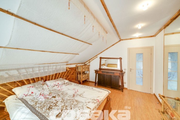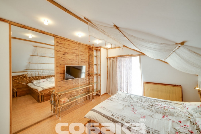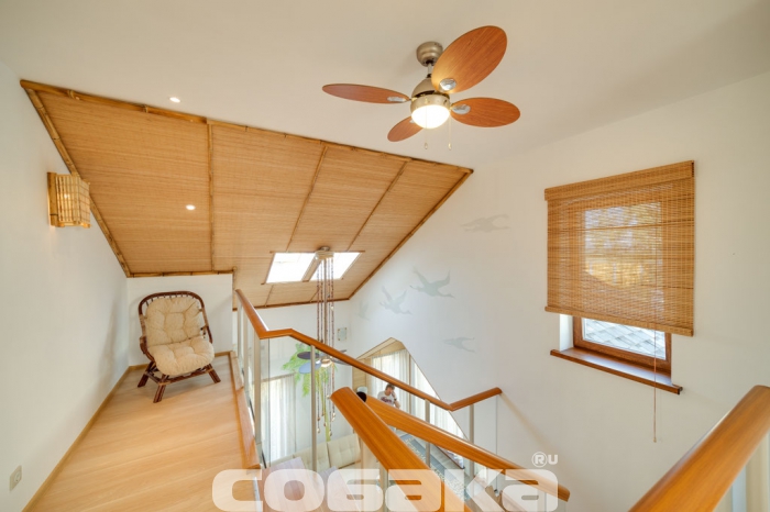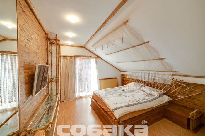 Ну а вотчина сна и отдыха – второй этаж. Две спальни, кровати в которых сделаны из бамбука, а комоды и трюмо гармонируют с мебелью столовой зоны первого этажа, усиливают сходство с бунгало.