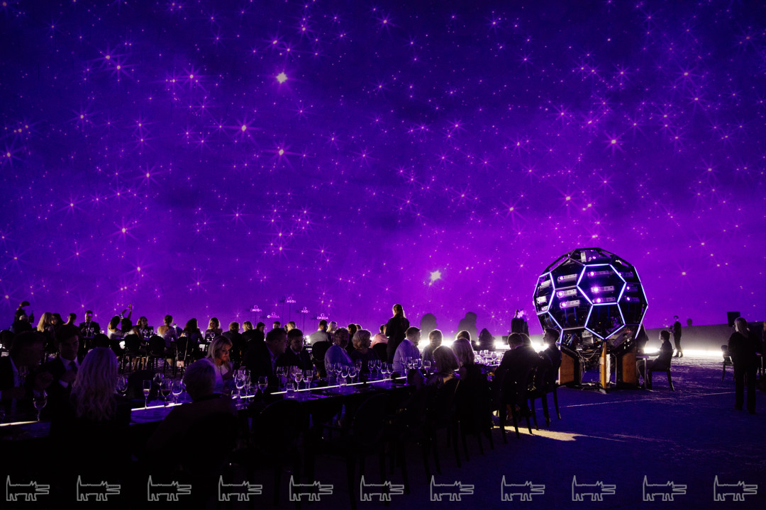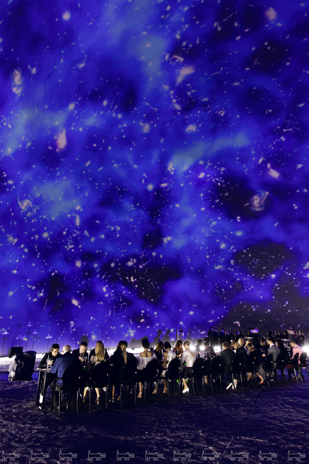 Прием продолжил гала-ужин в Планетарии №1. Купол над столами заполнили гигантские проекции космических тел, а пол пространства с помощью света и специальных декораций повторял лунный ландшафт. Меню ужина разработал обладатель звезды Мишлен – шеф-повар Массимилиано Сена из ресторана Il Lago женевского отеля Four Seasons Hotel des Bergues.