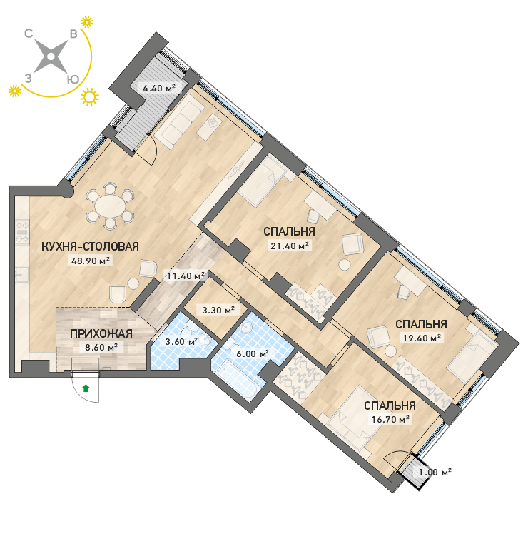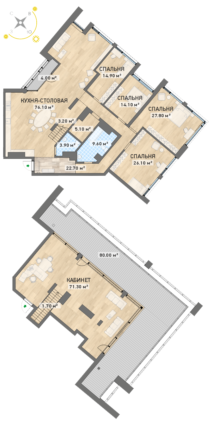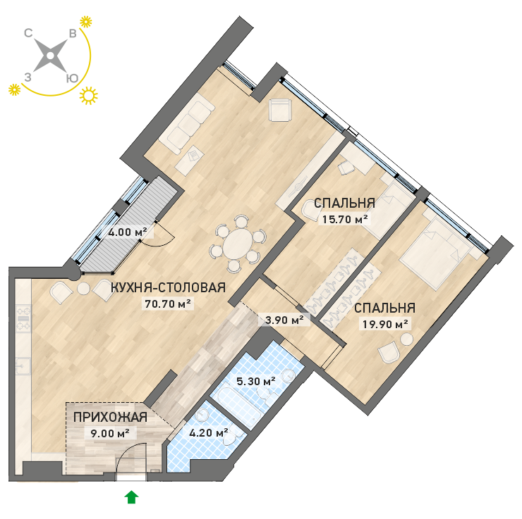 • Квартиры с 1, 2, 3 или 4 спальнями, площадью от 70 кв. м до 212 кв. м