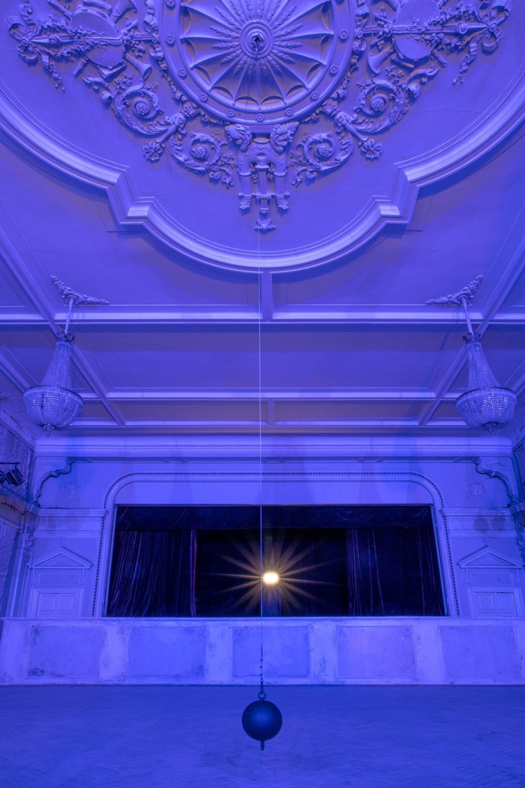 По соседству с «Выставкой одной картины» творится настоящая магия — проект художника Михаила А Креста превратил бывший актовый зал, в котором лепнина начала 20 века замиксована с барельефами советских матросов, в псевдоним-научную экспозицию в духе старинных кунсткамер. Сам автор определяет экспозицию как «собрание и мемориальный комплекс результатов исследовательской работы в области криптоанализа формальных текстов Природы, наблюдаемых в дискретной математике». Но пусть вас не пугает сложная концепция выставки и непонятные алхимические экспонаты в старых оригинальных музейных шкафах. Кульминация выставки — огромный маятник Фуко мерно раскачивается посреди белого зала, залитого синим светом. Кажется, именно так выглядят декорации для идеальной темно-вечеринки. Трогательная деталь — в канву выставки вплетены кривые зеркала 50-х годов, которые попали в Итальянский дворец из местного парка культуры и отдыха.