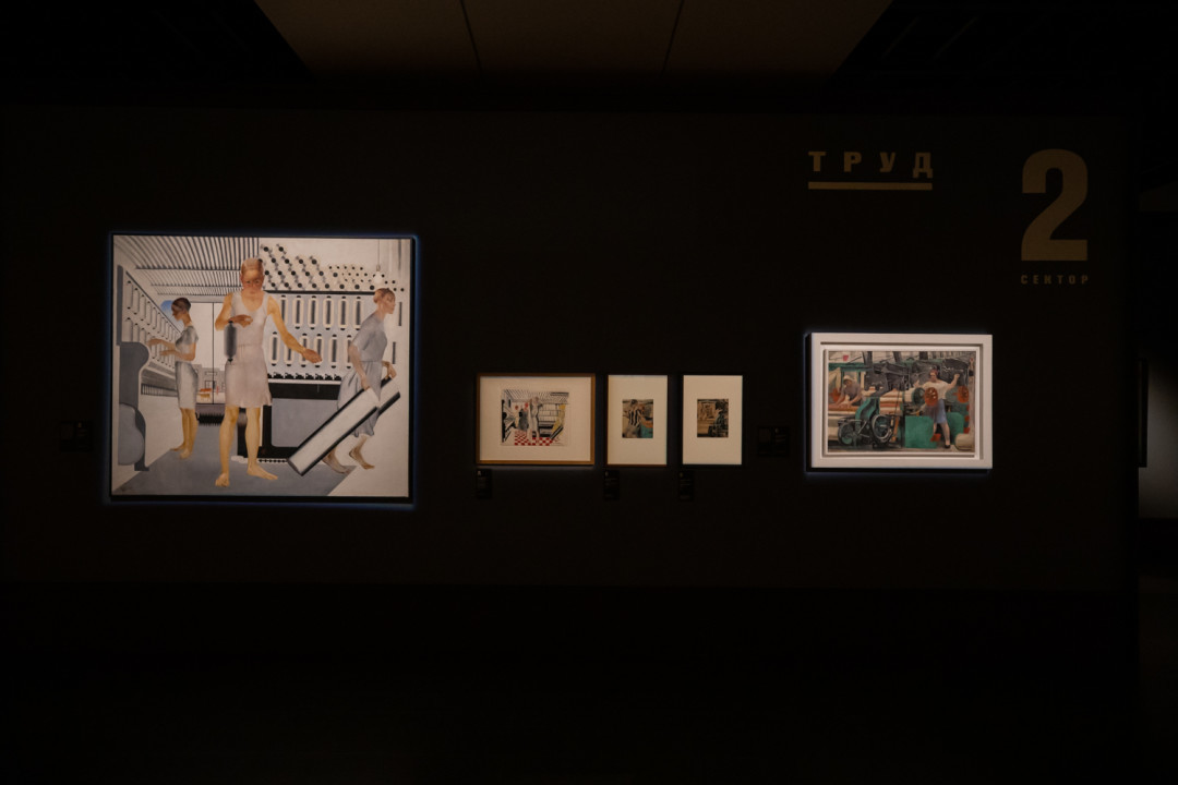 Конечно, есть. Мне очень нравится Самохваловская «Девочка с игрушкой» (1928) из Третьяковской галереи и Дейнека «На балконе» (1931), Самохвалов «После бани», «Девушка с табачной фабрики» Самохвалова же. «Кондукторшу» очень люблю. Вот «Шахтер» (1931) из американской частной коллекции — это часть работы, отрезанная самим Дейнекой когда-то от большой трехфигурной композиции; неясно, зачем он это сделал? Я его не видел раньше в цвете, только на черно-белой репродукции, и раму они нам тоже не показывали, пока работа не приехала в Петербург. К выставке мы, кстати, переоформили более 100 работ, это заняло очень много времени. А «Шахтер» был в такой фламандской раме, пышной, совершенно особенной, будто владельцы почувствовали религиозный контекст этой вещи. И я поместил ее в «красный угол», чтобы это подчеркнуть. В секции «Труд» у нас собрались «подземные люди» — именно там находится девушка с отбойным молотком Самохвалова — сложился пантеон новых богов новых времен. Не все это понимают с первого взгляда, поэтому и возвращаются на выставку снова и снова. Материала много, нужно дополнительное время.