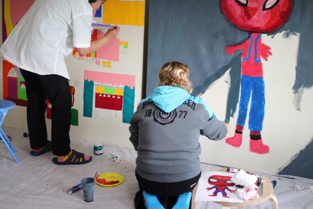 К тому же, будем честны — на одном человеческом милосердии далеко не уедешь — на нем нельзя построить устойчивые проекты. Наши ребята многое не могут, не умеют читать и писать, если я открою благотворительную булочную, то булочки буду печь я, а они будут стоять рядом. В мире искусства они могут реализоваться, потому что он демократичней, в нем меньше барьеров. В интернатах я познакомилась с обитателями параллельной реальности, которые делали невероятно мощное по энергетике искусство, но было непонятно, что с ними делать. Таких «молодых художников» едва ли можно сосватать в «обычную» арт-резиденцию на прокачку. Тогда мы с друзьями решили эту арт-резиденцию создать сами в центре Петербурга — полгорода ее строили с нами в подлестничном помещении в глубине классического двора-колодца на Гороховой улице. Параллельно мы со Стасом объезжали интернаты, провели опен-колл и выбрали из сотни ребят 40 человек, чтобы возить из ПНИ в студию тех, кому это действительно интересно. Стас Багс – известный современный стритарт-художник и инструктор по visual arts в нашем коммьюнити художников-самоучек. Он видит потенциал каждого автора и помогает его раскрыть, помогает подобрать оптимальную технику каждому. Как правило, в своей среде у них нет доступа ни к чему кроме бумаги и средней паршивости фломастера.