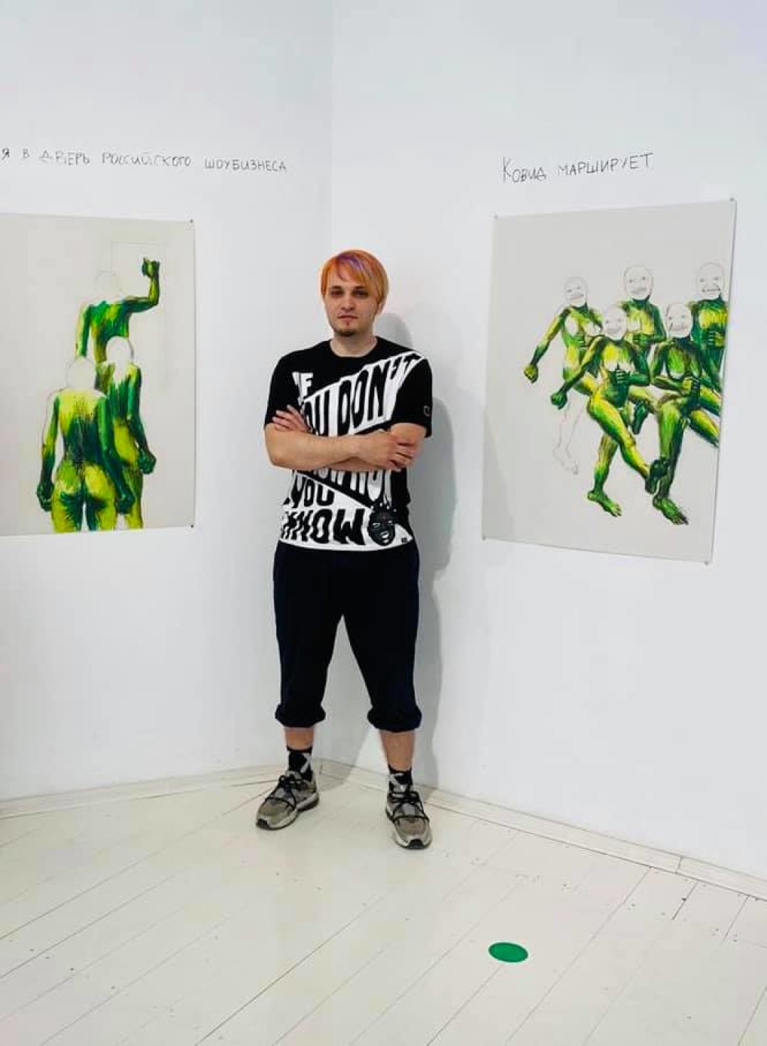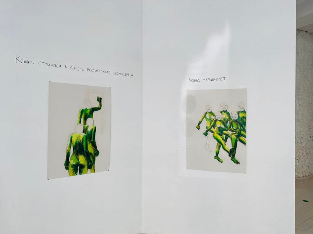 Галерея с панорамными окнами на улице Рубинштейна открылась выставкой «на злобу дня» — проектом «От зари до зари» выпускника отделения графики Академии Художеств Андрея Андреева. Как сообщает кураторский текст: «Андрей Андреев создает имперсональный образ Ковида, который является собирательным образом человечества эпохи коронавирусной пандемии. Этот образ сочетает в себе признаки обоих полов, а зеленый цвет их кожи напоминает юникод-эмоджи вируса и того самого альтрайтовского лягушонка Пепе».