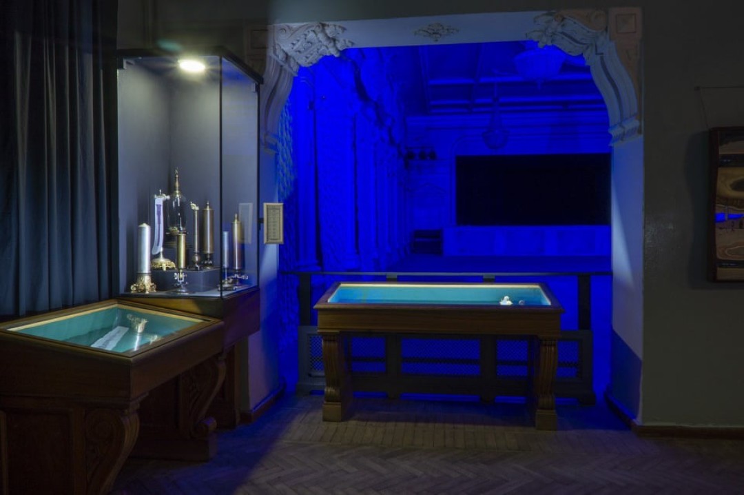 Свою натурфилософскую экспозицию с элементами эзотерики Михаил построил между двух чисел. 273 — столько костей есть в зрелом организме, за такое же количество дней женщина вынашивает ребенка. Цифра 153 взята из Евангелия от Иоанна — столько крупных рыб выловили голодные рыбаки в одной из притч, толкователи до сих пор спорят об истинном духовном значении этой комбинации. Кульминация фантазийного музея и одновременно оммаж Иву Кляйну — залитый синим светом (как на рейве!) бывший актовый зал с лепниной и барельефами советских моряков, в центре — качается маятник Фуко. Саундтрек — тревожная музыка композиторов-минималистов. Кстати, произведение 4'33 самого известного из них — Джона Кейджа — длится ровно 273 секунды тишины.
