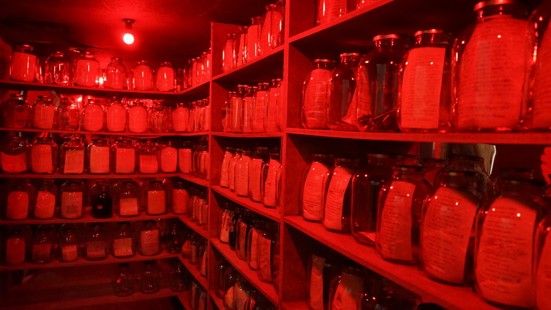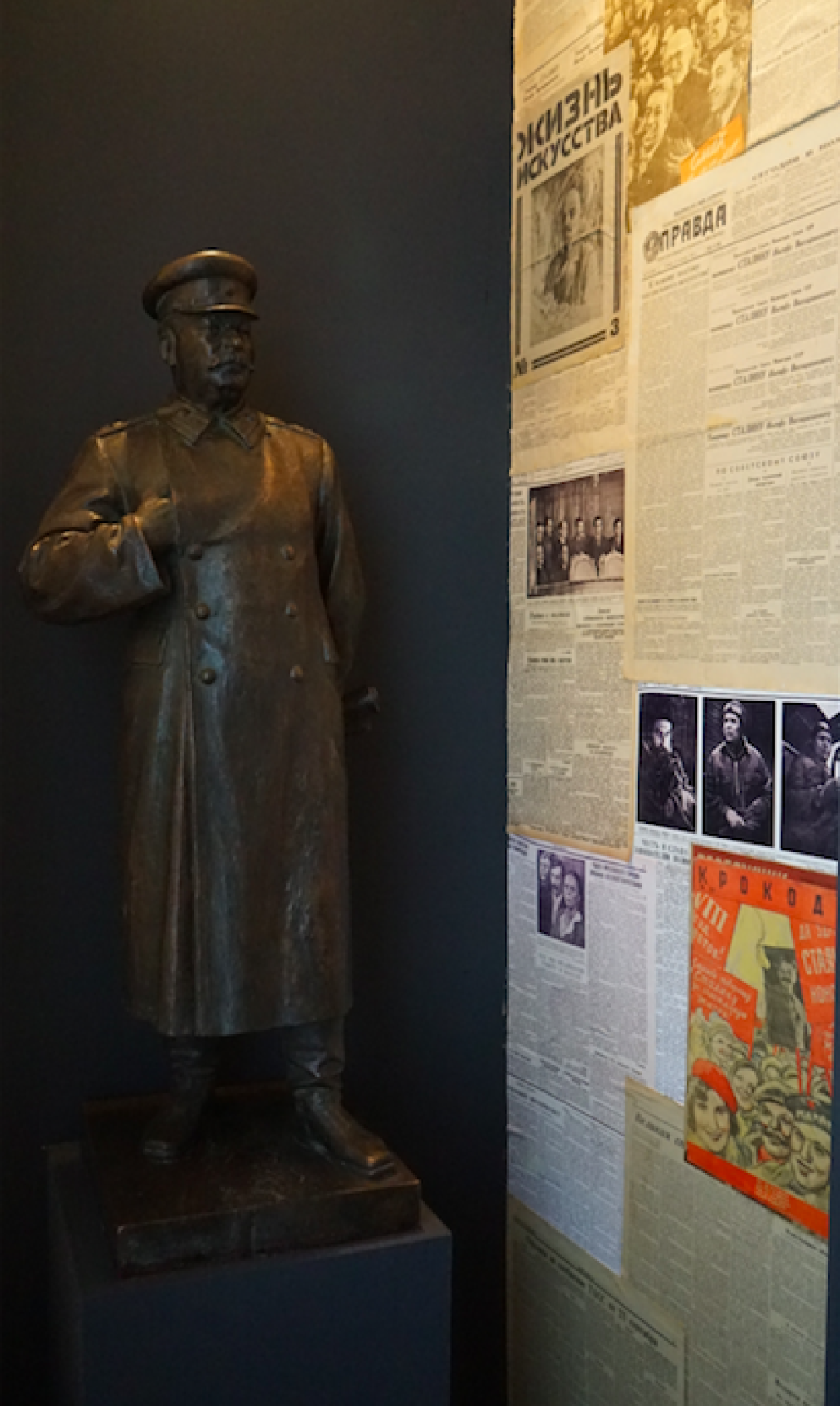 Описывать и пересказывать происходящее в «Пятом измерении» не хочется — это все равно что спойлерить в рецензии на сериал. За каждой дверью — «своя атмосфера»: вы будете вчитываться с фонариком в стихотворные черновики, расфасованные по банкам, окажетесь запертыми один на один с фигурой Сталина (во всех смыслах), перед фото с десятком недружелюбных взглядов, изучите строчки из публичных «разборов» обоих писателей («поэтесса, которая мечется между будуаром и молельней», «безбилетный пассажир в советском поезде, и наглый пассажир, который требует себе места»). Некоторые комнатки этой «нехорошей квартиры» настолько малы, что туда еле-еле помещается один человек — удивительная роскошь смотреть выставку в полном одиночестве «мэтчится» с требованиями безопасности во время пандемии;