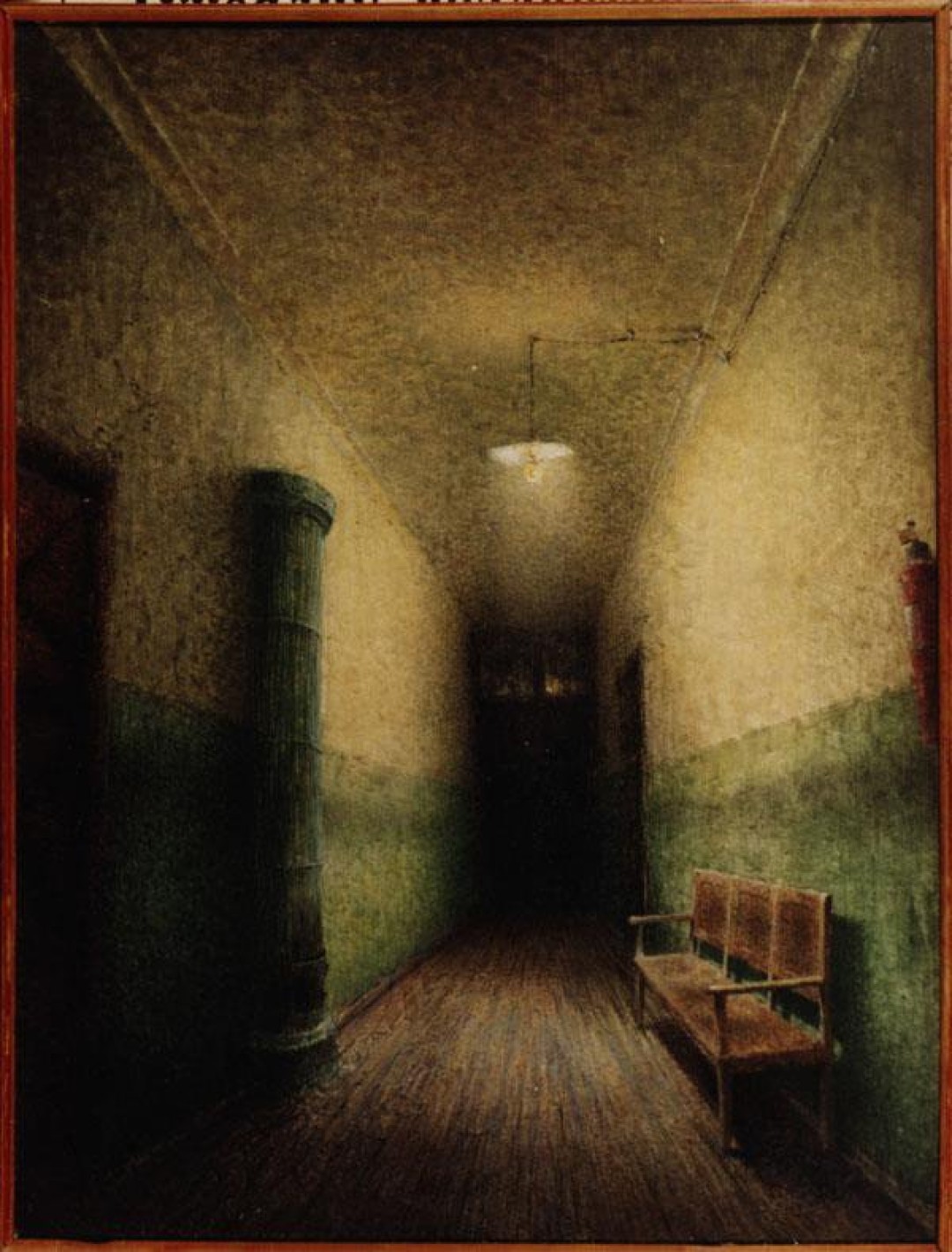 В выстроенном коридоре висит картина Евгения Ухнаева «Присутствие» 1930-х с мрачным коридором и тусклой лампочкой из фондов музея — ее Сергею показала во время разработки дизайна экспозиции сокуратор выставки Жанна Телевицкая. Так эскиз архитектурного решения Сергея неожиданно подкрепилась художественным образом — идеальное совпадение. Тревога возникает у зрителя, идущего по коридору, сама собой — благо за это отвечает саунд-дизайн Ивана Андриянова. Да, для этой выставки специально был создан звуковой ряд.