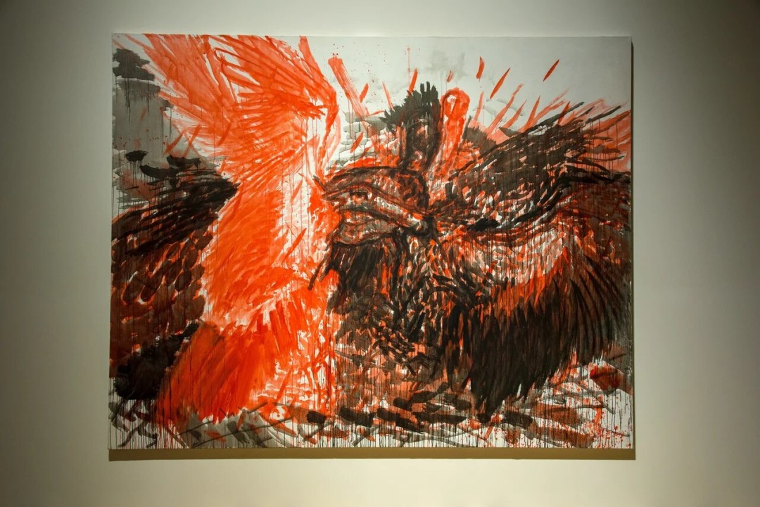 Идея реинкарнации максимально наглядно показана в серии «Перерождение» — одной из самых «свежих». В технике акриловой живописи Чжан Хуань иллюстрирует буддийский обряд «небесного погребения»: довольно мрачный (в оптике западного зрителя) способ прощаться с умершими — их трупы отдаются на растерзание хищным птицам. Этот обряд — тоже процесс: тело не просто оставляют в горах, но ритуально разделывают ножом, скелет, после пиршества грифов, перерабатывают до состояния пыли специальные люди, чтобы в финале отдать воронам. Даже смерть в буддизме является процессом, во время которого душа ищет себе новое тело — конечно, если ей не повезло, и она все еще в колесе сансары. И в эту серию идейно встраиваются новые работы художника, основанные на его дневнике пандемии и выполненные в той же технике. Хроника неправильных, трагических смертей заканчивается обещанием жизни и любви: эта серия работ называется «Love».