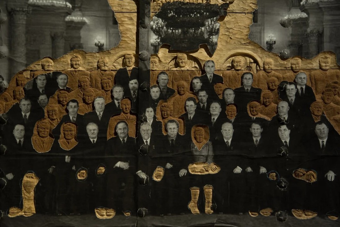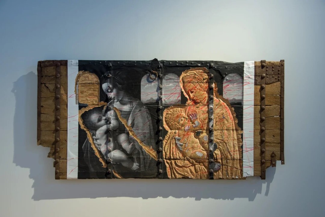 Выставка «Чжан Хуань. В пепле истории» делится на три смысловых отрезка: «Мой Зимний дворец», «В пепле истории» и «Перерождение». В Аванзале представлены работы, сделанные специально для выставки после визита художника в музей год назад. В этой серии, посвященной Зимнему дворцу, Чжан Хуань использует старинную технику дунъянской резьбы по дереву и воспроизводит сюжеты картин из эрмитажной коллекции. Тут мы внезапно сталкиваемся с благосклонным отношением художника к влиянию советской художественной школы — она привила ему как знание истории искусств, так и практические навыки реалистического рисунка. Однако в этой серии он сталкивает две культуры, воспроизводя классические образы западного канона на старинных деревянных дверях, спасая таким образом осколок культуры и традиций, а также технику от смерти.