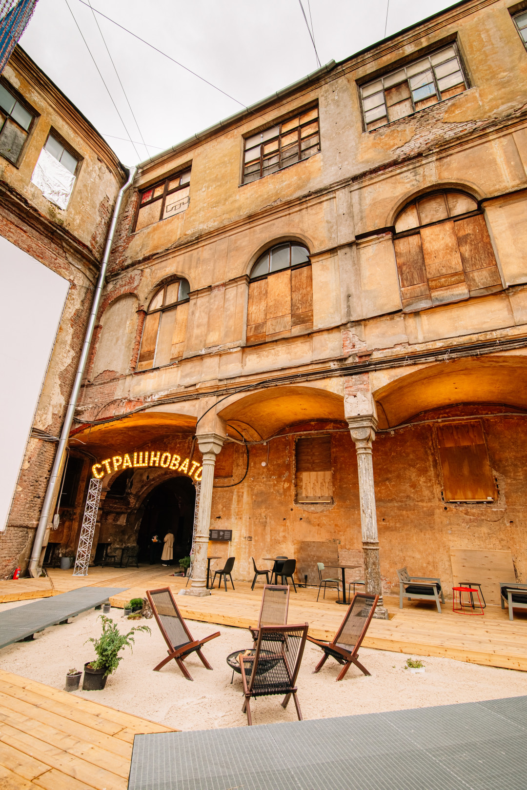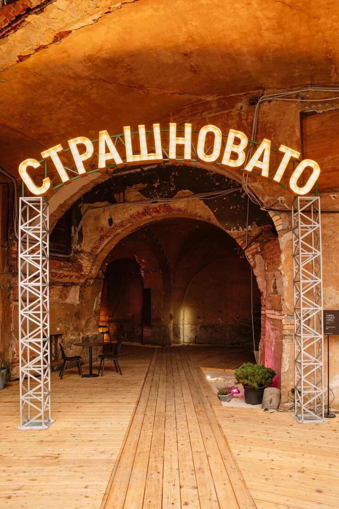 Галерея MYTH gallery долго не могла «пристроить» работу художницы Алины Глазун — арку с большой надписью «Страшновато», сияющей в темноте. Слишком провокационно для большинства общественных пространств. Владельцы кластера «Третье место», который открылся во дворе на Литейном проспект, 62 чуть больше месяца назад, рискнули: теперь на фоне объекта фотографируются многочисленные посетители. Вечером там вместо банальных dj-сетов проходили «диджей баттлы» медиа-художников и виджеев (спасибо петербургскому визитеру Виктору Кудряшову).