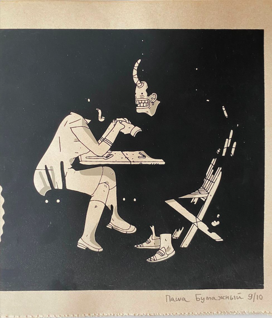 Паша Бумажный может пририсовать улыбку случайному кирпичику на улице, сделать рисунок на коробке из-под пиццы или добавить странного мохнатого персонажа на страницы случайного лукбука — и это уже будет круто. Приведем фрагменты его интервью в каталог графического кабинета WoD: «Как давно вы стали художником? Не стал. Можно ли выучиться на художника? Как соотносятся в вашем творчестве образование и интуиция? Видимо, нет. •_• Часто ли вас просят разъяснить свои работы? Как вы к этому относитесь? Никогда. Чудесно».