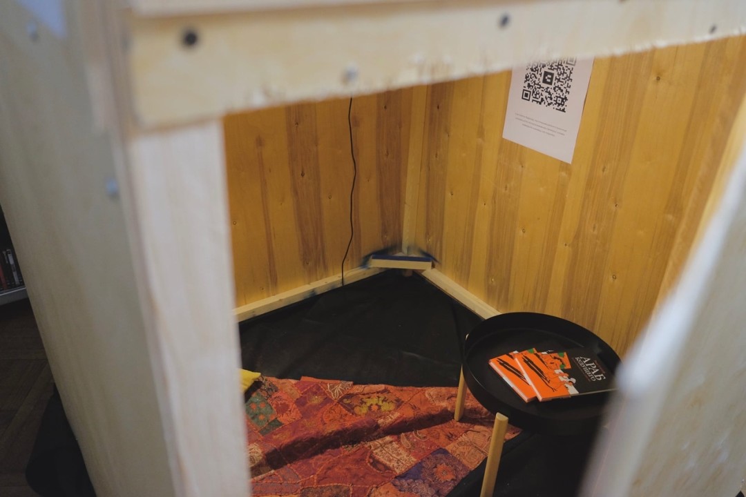 Комикс Риада Саттуфа с подзаголовком «Детство на Ближнем Востоке» рассказывает историю ребенка, чья семья переехала из Франции в Ливию. Действие разворачивается в 1980-х. В Ливии — диктатура Каддафи, бедность, трущобы, заброшенные дома. Тут нет «своего дома», в какой ты сегодня смог попасть чтобы переночевать — тот и твой. Художница Алина Исмаилова предлагает читать комикс в нарочито чужеродной интерьеру бывшего дворца фанерной коробке. Тут двойная ирония — раньше дворец, сейчас комната со страшненькими стеллажами и батареями учебников на иностранных языках. Дальше — фанерная коробка. Три слоя. Вы можете запереться изнутри — сегодня коробка будет вашим домом. Снаружи ходят люди, выдают и принимают книги, а у вас - ковер и лампа. На стене коробки есть QR-код — если навести на него камеру, то можно увидеть женщину, пропалывающую грядки. Смотрите снизу вверх - сегодня вы ребенок, вы в Ливии, и вам два.