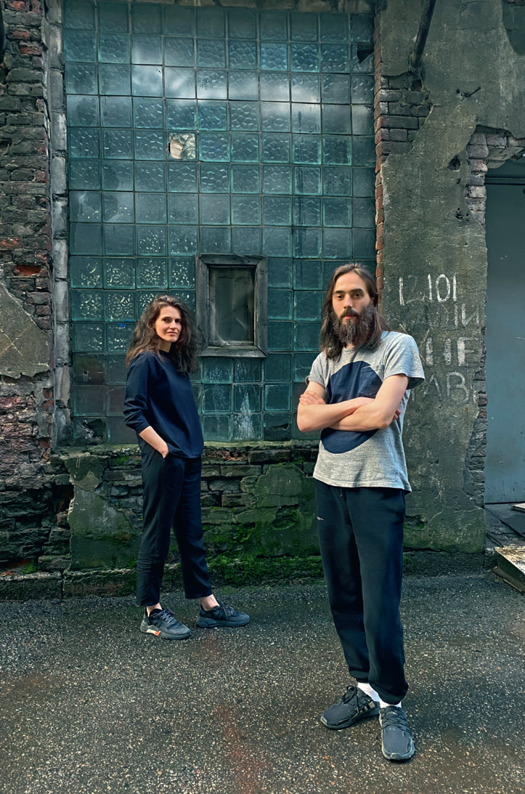 Кристина и Александр сфотографированы в пространстве «Севкабель Порт»: здесь был первый кабельный завод в России — советские ГЭС и метрополитен Москвы
