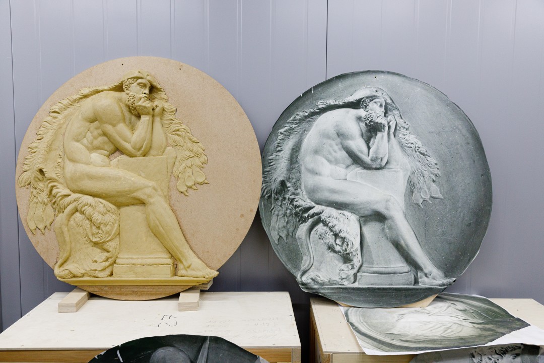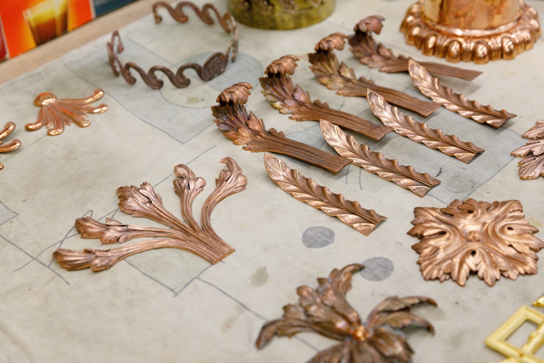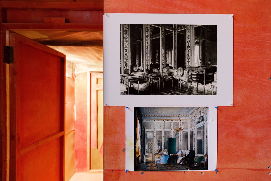 После войны в разрушенных залах среди обломков были обнаружены фрагменты фаянса и бронзы, что помогает реставраторам воссоздать интерьеры в нужных материалах и цветах. В случае наличия подлинных образцов специалисты прибегают к технике гальванопластики, однако она применима только к металлическим элементам отделки.