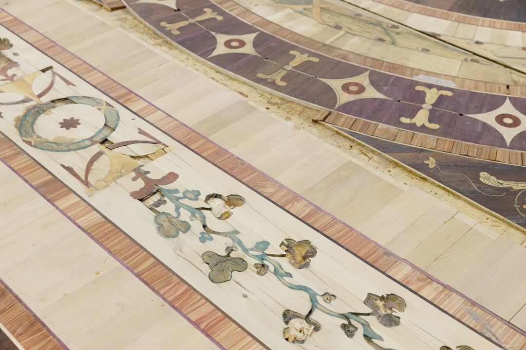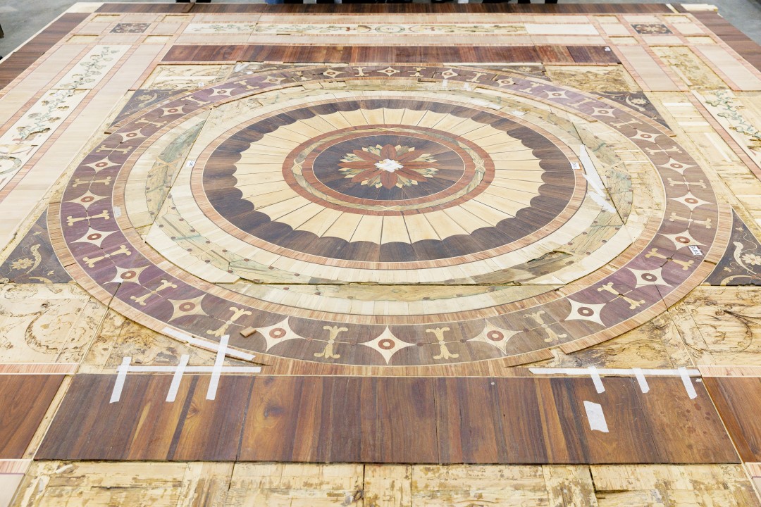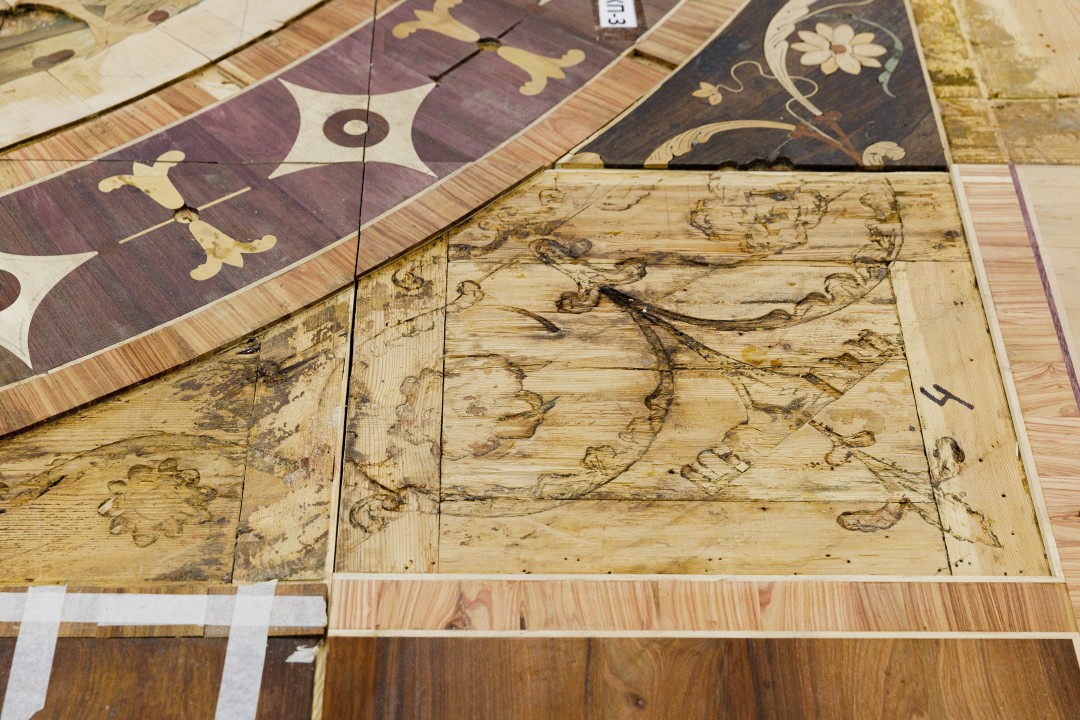 Собирая необходимую информацию по крупицам и утверждая решения в несколько этапов, реставраторы продолжают работу над масштабным проектом. В помещениях Царскосельской янтарной мастерской в Тярлево специалисты восстанавливают подлинный паркет Зеркального кабинета, в годы войны вывезенный в Берлин и по счастливой случайности найденный и возвращенный в музей в 1947 году (вместе с паркетом Лионского зала). По словам художника-реставратора Максима Григорьева, основная задача сейчас — устранить последствия неудачной попытки реставрации 70-х годов. Для восстановления рисунка, утратившего геометрию, мастера используют ценные породы дерева, из которых был собран оригинальный паркет: самшит, клен, палисандр, амарант, розу. Работы должны завершиться до конца года, но монтироваться в зал паркет будет в последнюю очередь.