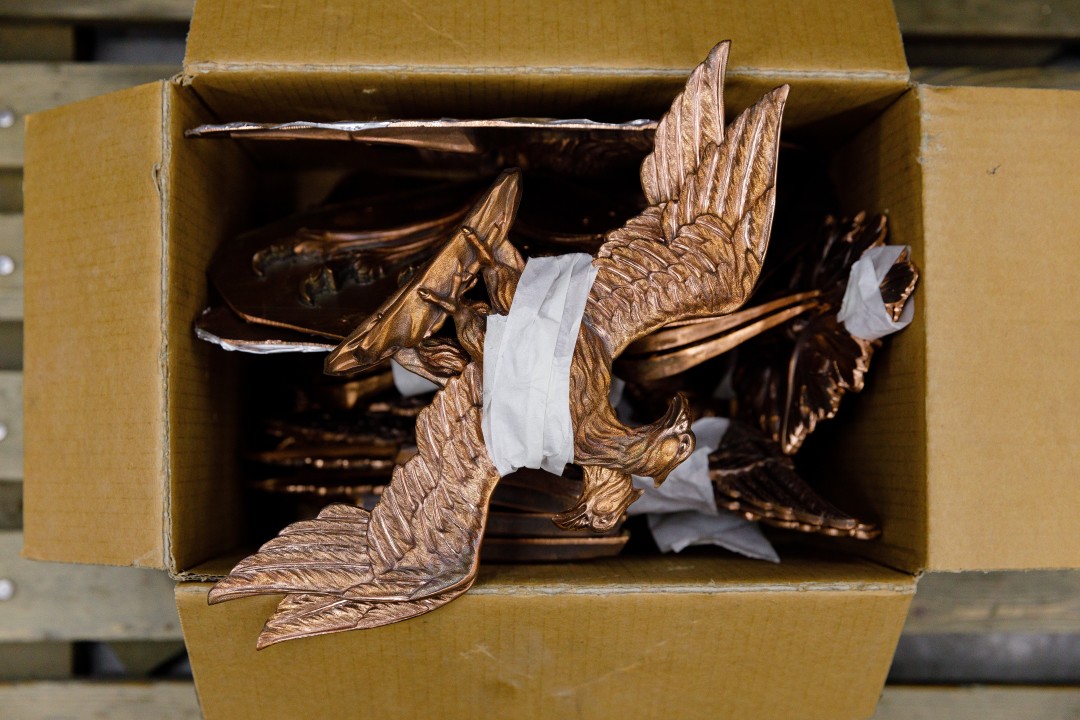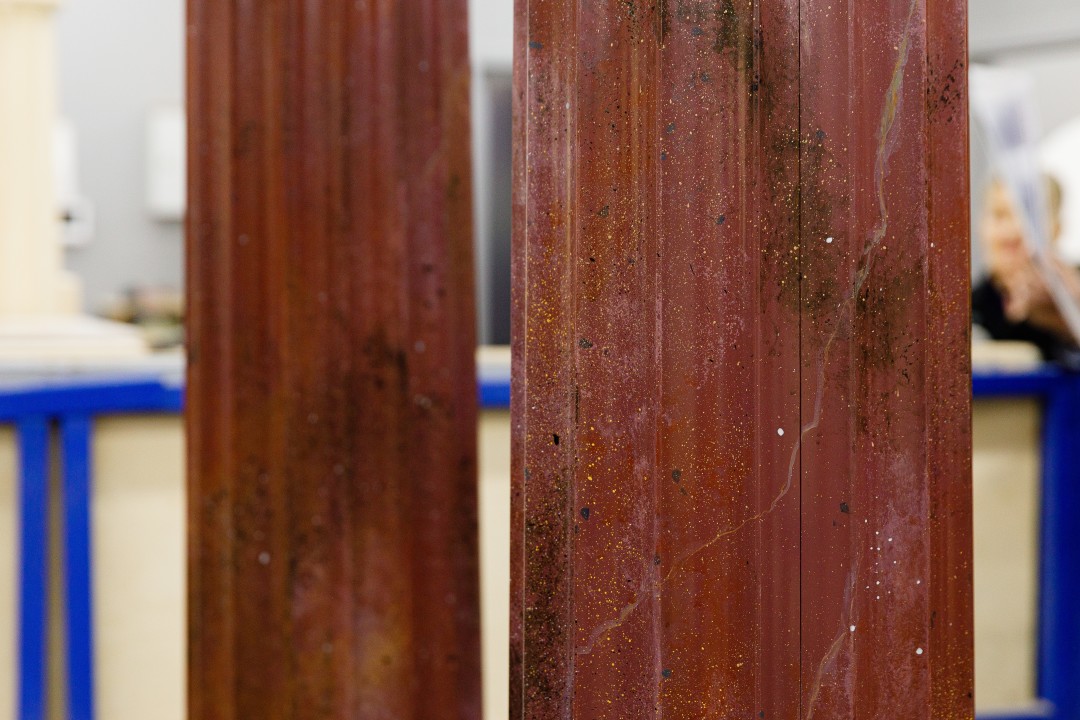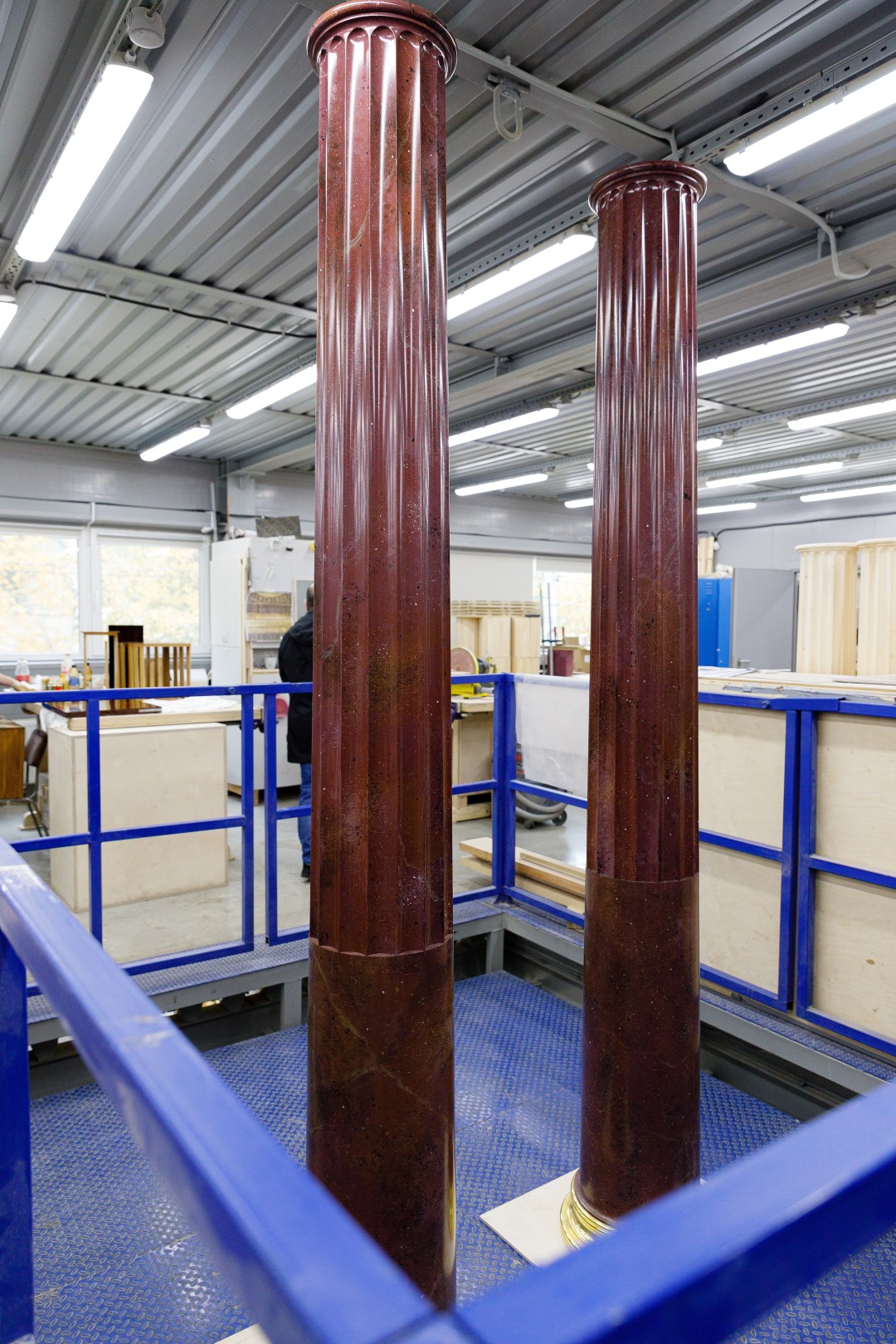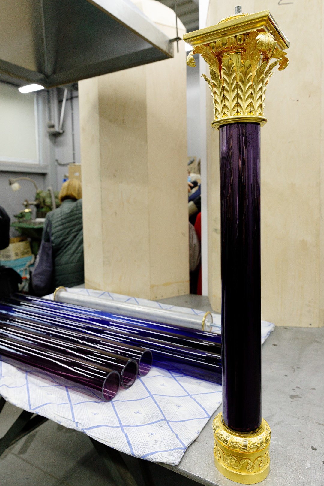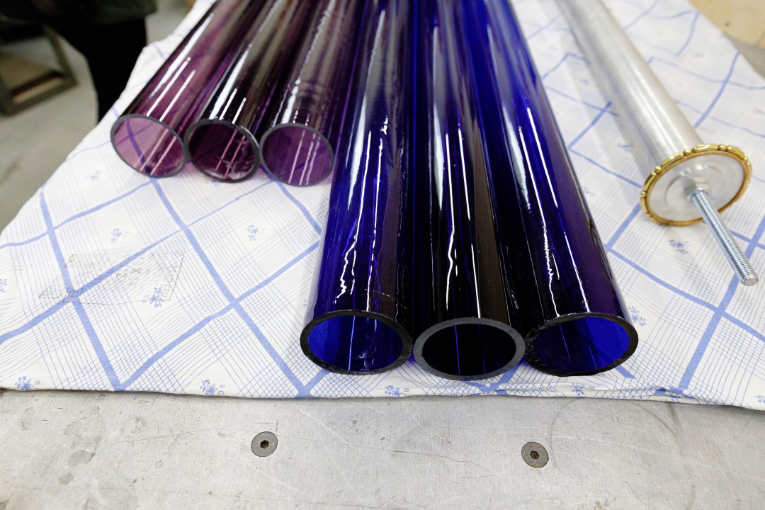 При создании оформления Опочивальни и Табакерки — так Екатерина называла Синий кабинет за его миниатюрные размеры — мастера работают с цветным стеклом. Для Опочивальни будет изготовлено 39 колонн из аметистового стекла — каждая 3,7 метра высотой.