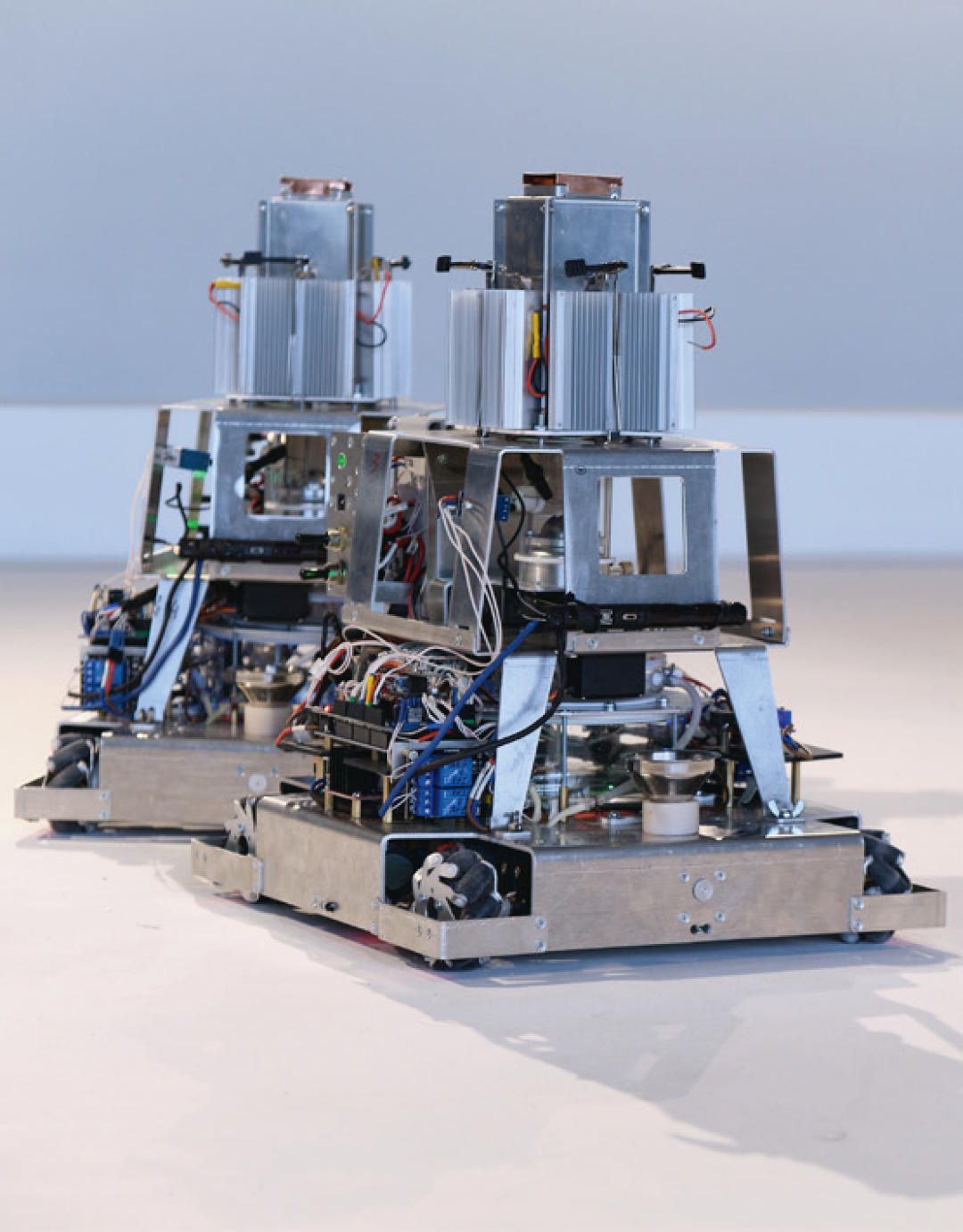 Кураторы: В вашей инсталляции есть роботы, и в устройстве каждого — резервуар с керосином и датчики, анализирующие данные о керосине. Когда гриб заражает керосин, тот меняет запах. Как происходит взаимодействие между роботами?